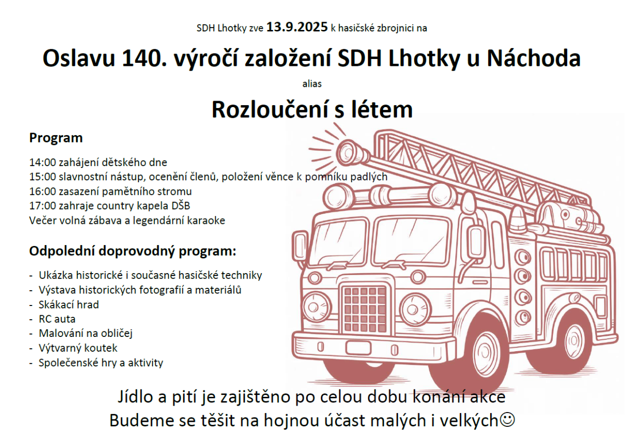 Pozvánka na oslavy 140. let výročí založení SDH Lhotky u Náchoda alias Rozloučení s létem dne 13.9.2025 od 14 hodin.