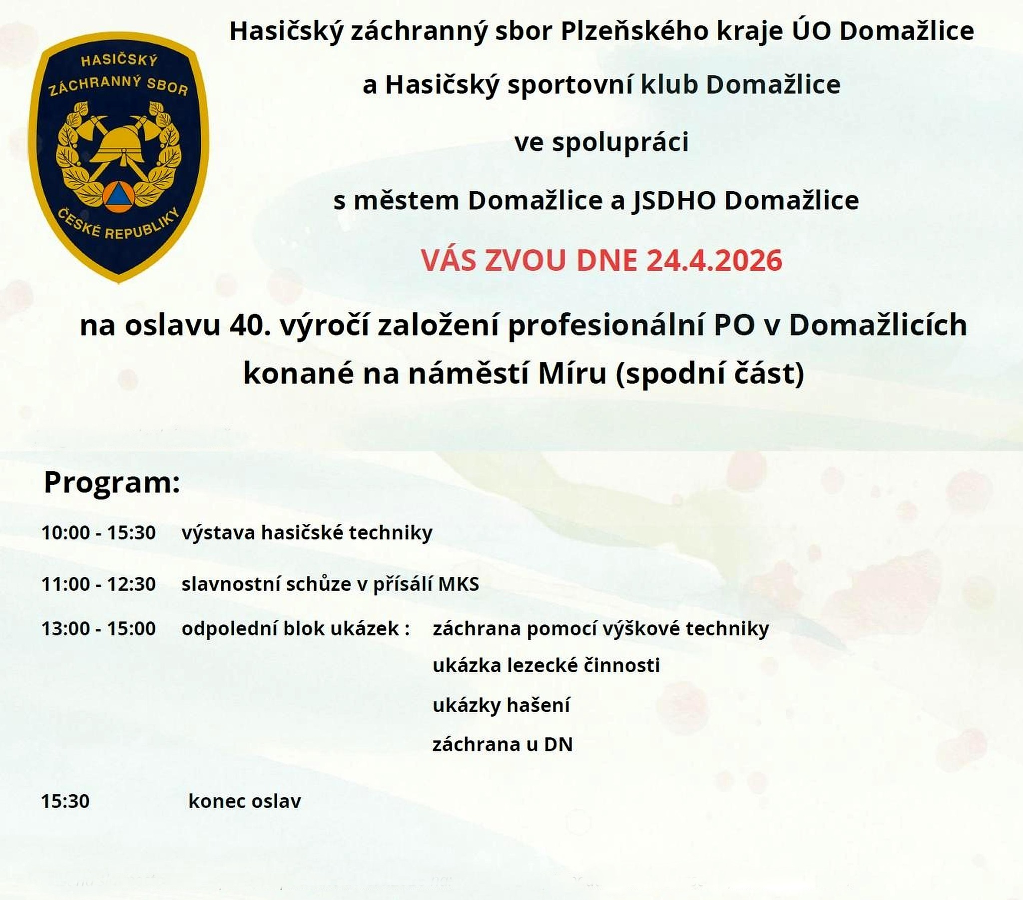 Pozvánka na akci: 24.4.2026 – Domažlice – 40 let HZS