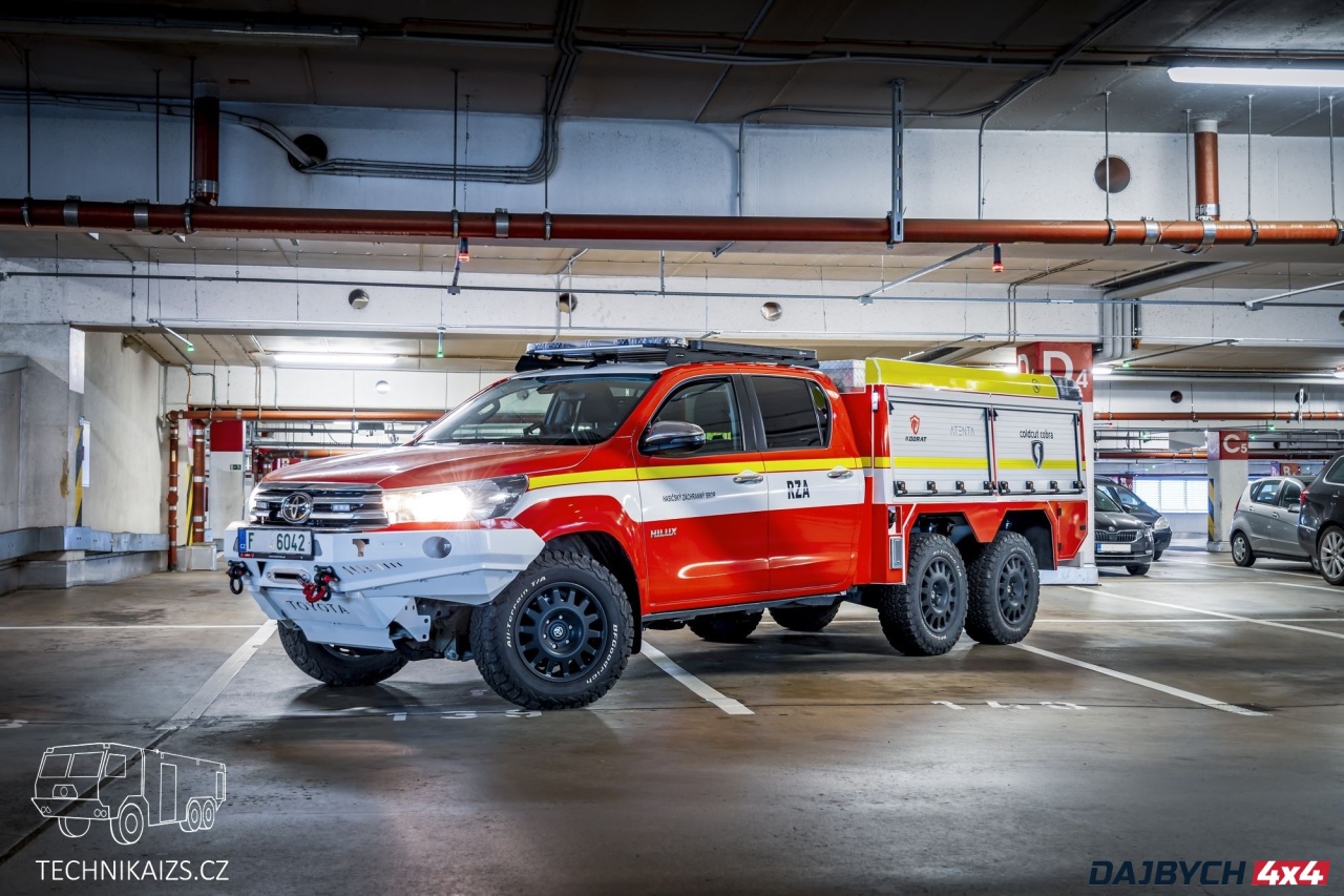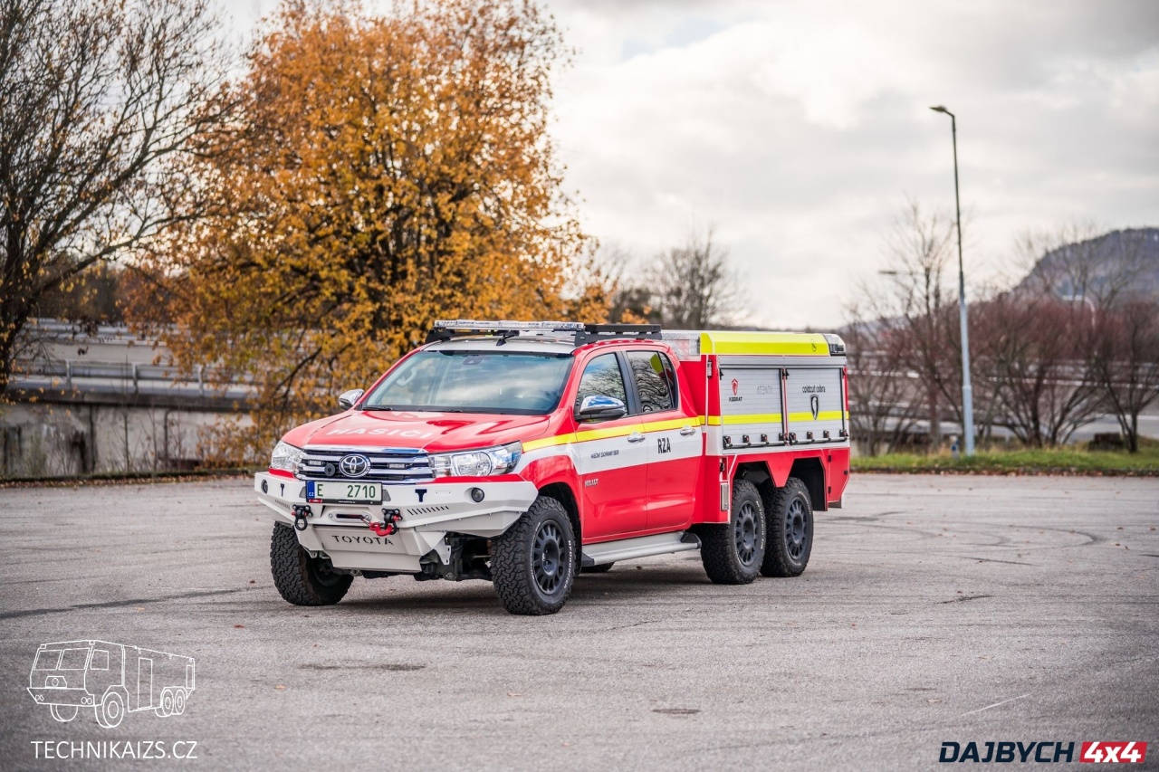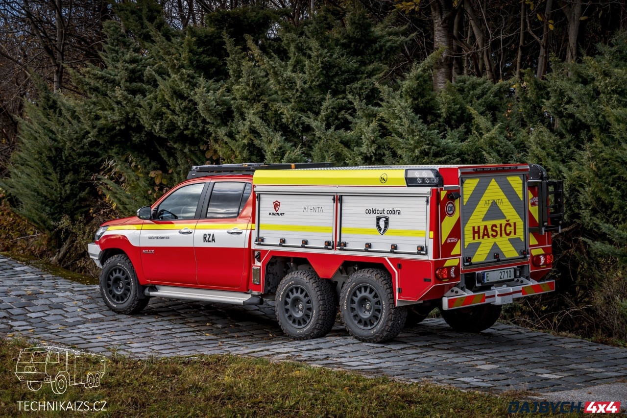 Doplňující info: Společnosti DAJBYCH 4×4 a KOBIT – THZ vytvořily ve spolupráci s Generálním ředitelstvím HZS ČR unikátní rychlý zásahový automobil Toyota Hilux Atenta. Vůz je svou koncepcí a vybavením určen pro zásahy při požárech elektromobilů. Jeho výhodou je kromě terénního podvozku velice malá výška – 1 850 mm. Toyota je dlouhá 6 309 mm a široká 1 982 mm. V přední části je za nárazníkem uchycen elektrický lanový naviják s tažnou silou 15 kN a jištěním proti přetížení, nechybí vyprošťovací oka. O dobíjení a konzervaci akumulátorů se stará zásuvka na levém boku Toyoty. Karosérie účelové nástavby je vyrobena z plechů a profilů ze slitiny lehkých kovů technologií prizmatických šroubovaných spojů a lepení a doplněna o laminátové designové prvky. Vnější LED osvětlení nástavby je zapuštěno do bočních okapnic, schrány jsou kryty hliníkovými roletkami s průběžnými madly v celé šířce roletky. Vozidlo je vybavené vysokotlakým hasicím systémem ColdCut Cobra 7-C330P kit, umožňující rychlé a efektivní hašení trakčních akumulátorů. Cobra pracuje s tlakem až 300 barů při průtoku 28 litrů za minutu. Na konci 80metrové hadice je proudnice s možností regulace proudu od paprsku až po široký kužel. Systém je uložen na výsuvném platu v zadní části nástavby. Součástí výbavy je akumulátorové vyprošťovací nářadí Holmatro, přetlaková ventilace, detekční technika a předepsaná výbava RZA.