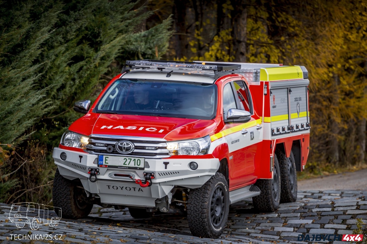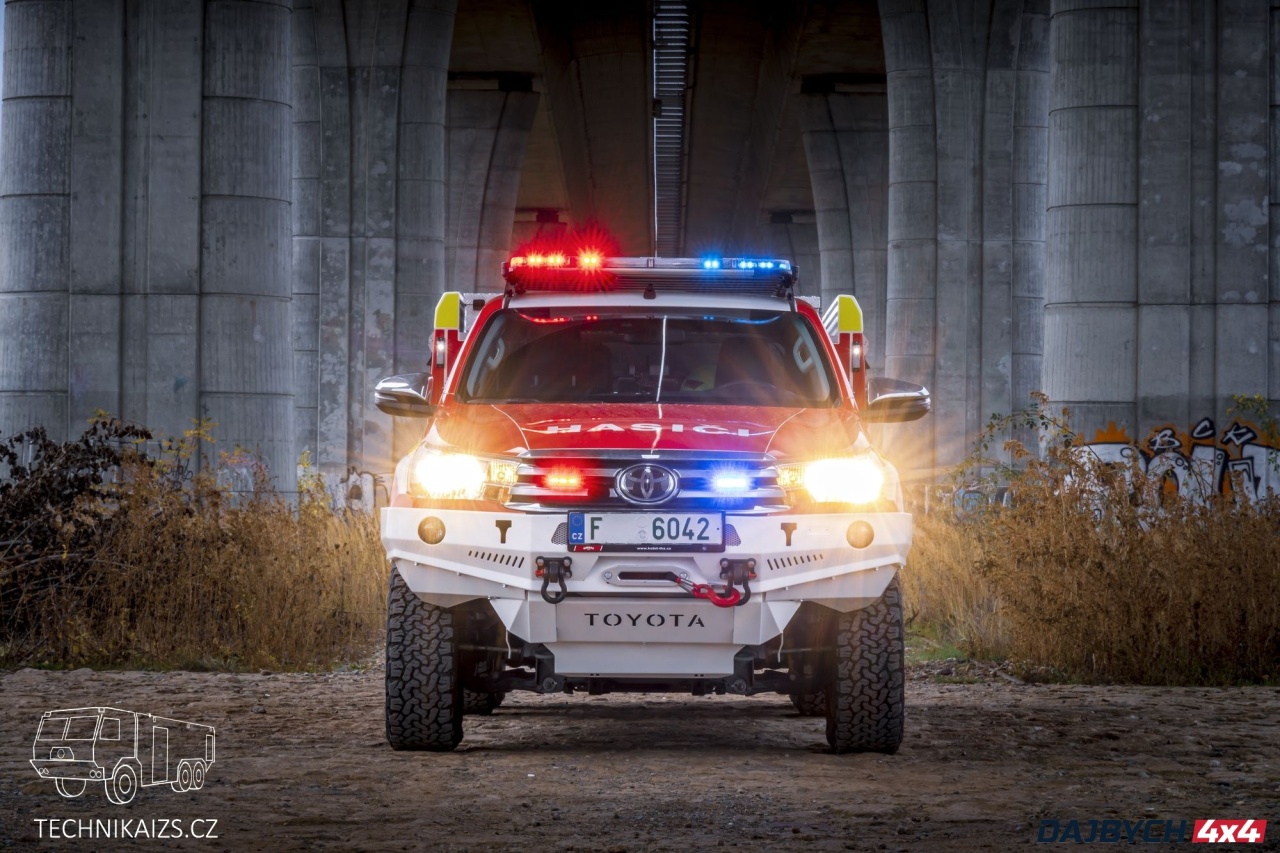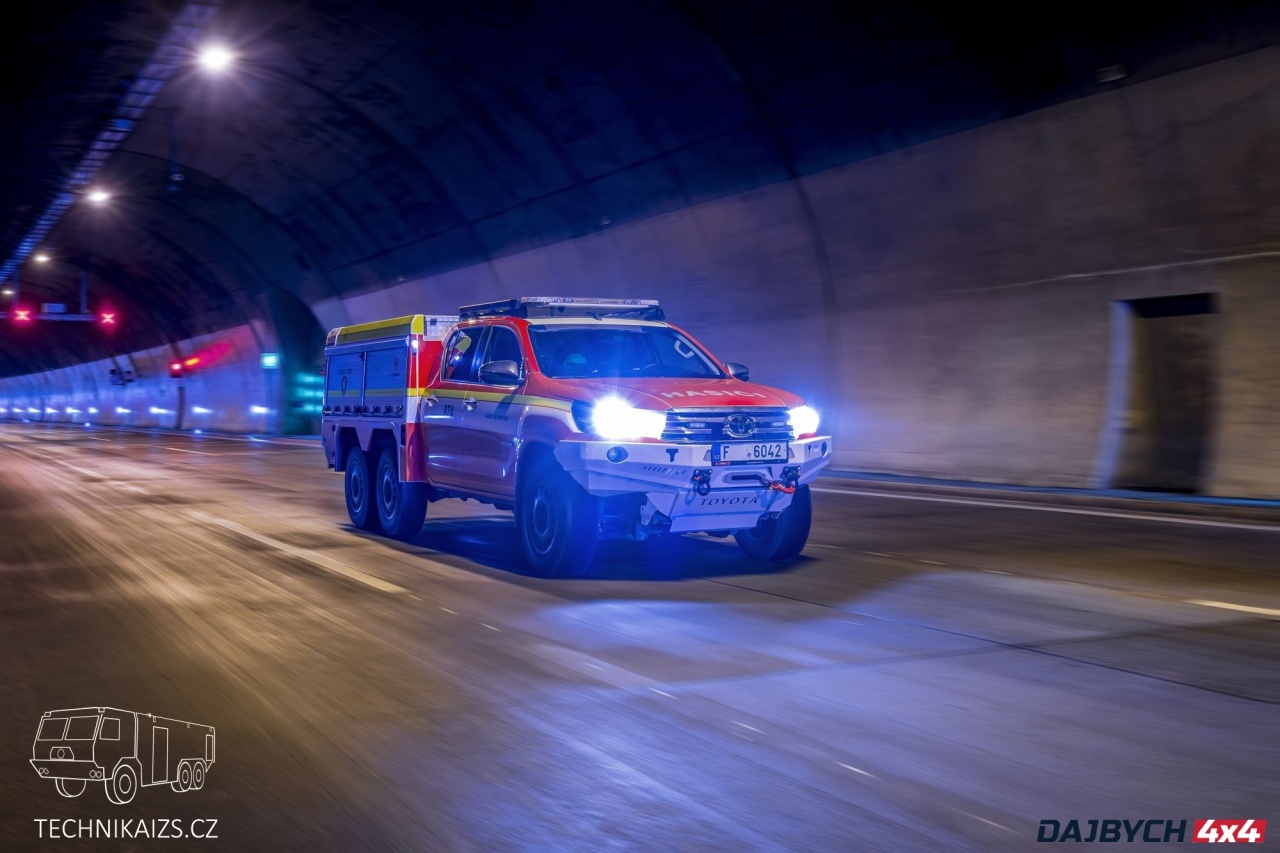 Doplňující info: Společnosti DAJBYCH 4×4 a KOBIT – THZ vytvořily ve spolupráci s Generálním ředitelstvím HZS ČR unikátní rychlý zásahový automobil Toyota Hilux Atenta. Vůz je svou koncepcí a vybavením určen pro zásahy při požárech elektromobilů. Jeho výhodou je kromě terénního podvozku velice malá výška – 1 850 mm. Toyota je dlouhá 6 309 mm a široká 1 982 mm. V přední části je za nárazníkem uchycen elektrický lanový naviják s tažnou silou 15 kN a jištěním proti přetížení, nechybí vyprošťovací oka. O dobíjení a konzervaci akumulátorů se stará zásuvka na levém boku Toyoty. Karosérie účelové nástavby je vyrobena z plechů a profilů ze slitiny lehkých kovů technologií prizmatických šroubovaných spojů a lepení a doplněna o laminátové designové prvky. Vnější LED osvětlení nástavby je zapuštěno do bočních okapnic, schrány jsou kryty hliníkovými roletkami s průběžnými madly v celé šířce roletky. Vozidlo je vybavené vysokotlakým hasicím systémem ColdCut Cobra 7-C330P kit, umožňující rychlé a efektivní hašení trakčních akumulátorů. Cobra pracuje s tlakem až 300 barů při průtoku 28 litrů za minutu. Na konci 80metrové hadice je proudnice s možností regulace proudu od paprsku až po široký kužel. Systém je uložen na výsuvném platu v zadní části nástavby. Součástí výbavy je akumulátorové vyprošťovací nářadí Holmatro, přetlaková ventilace, detekční technika a předepsaná výbava RZA.