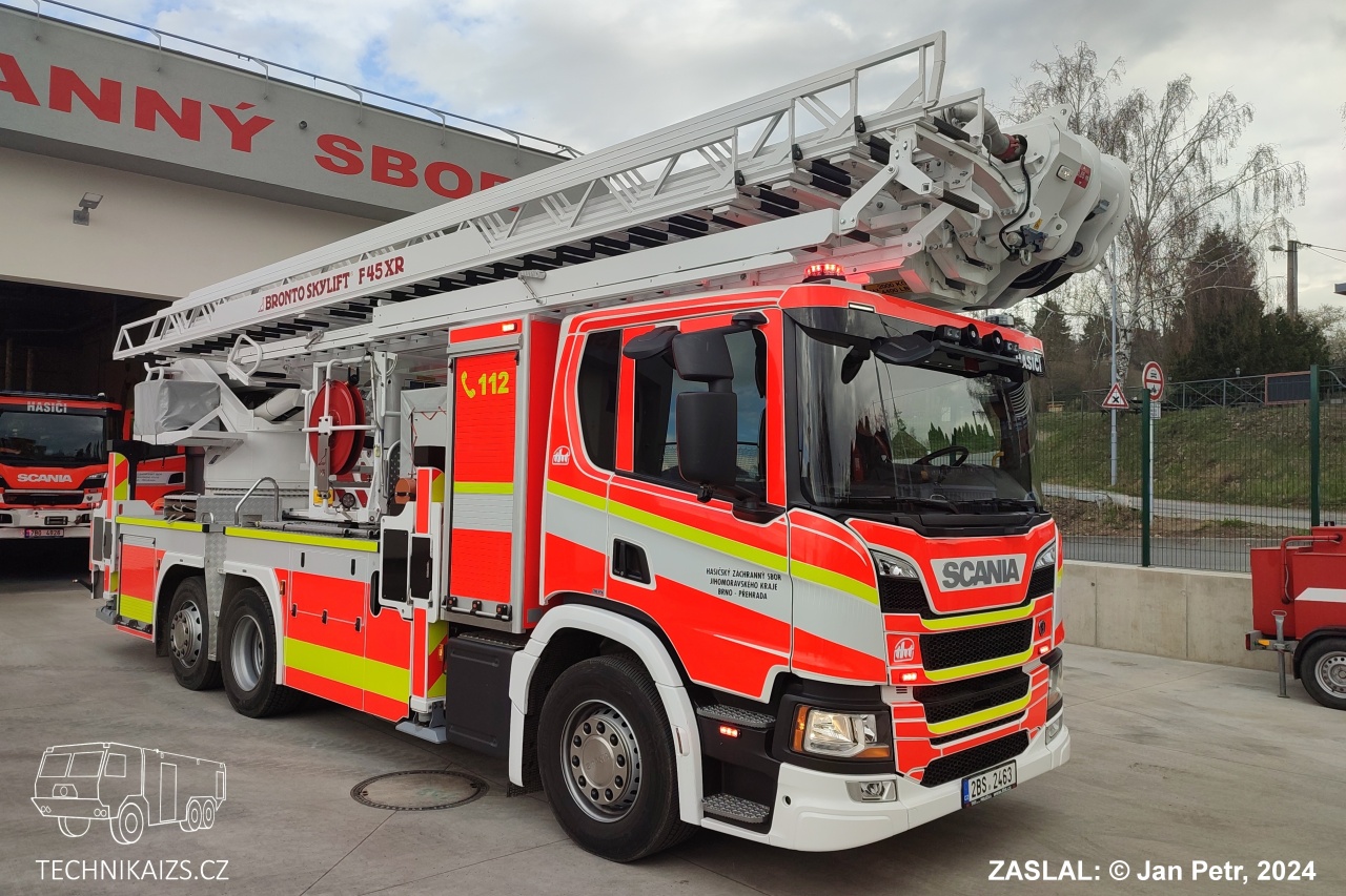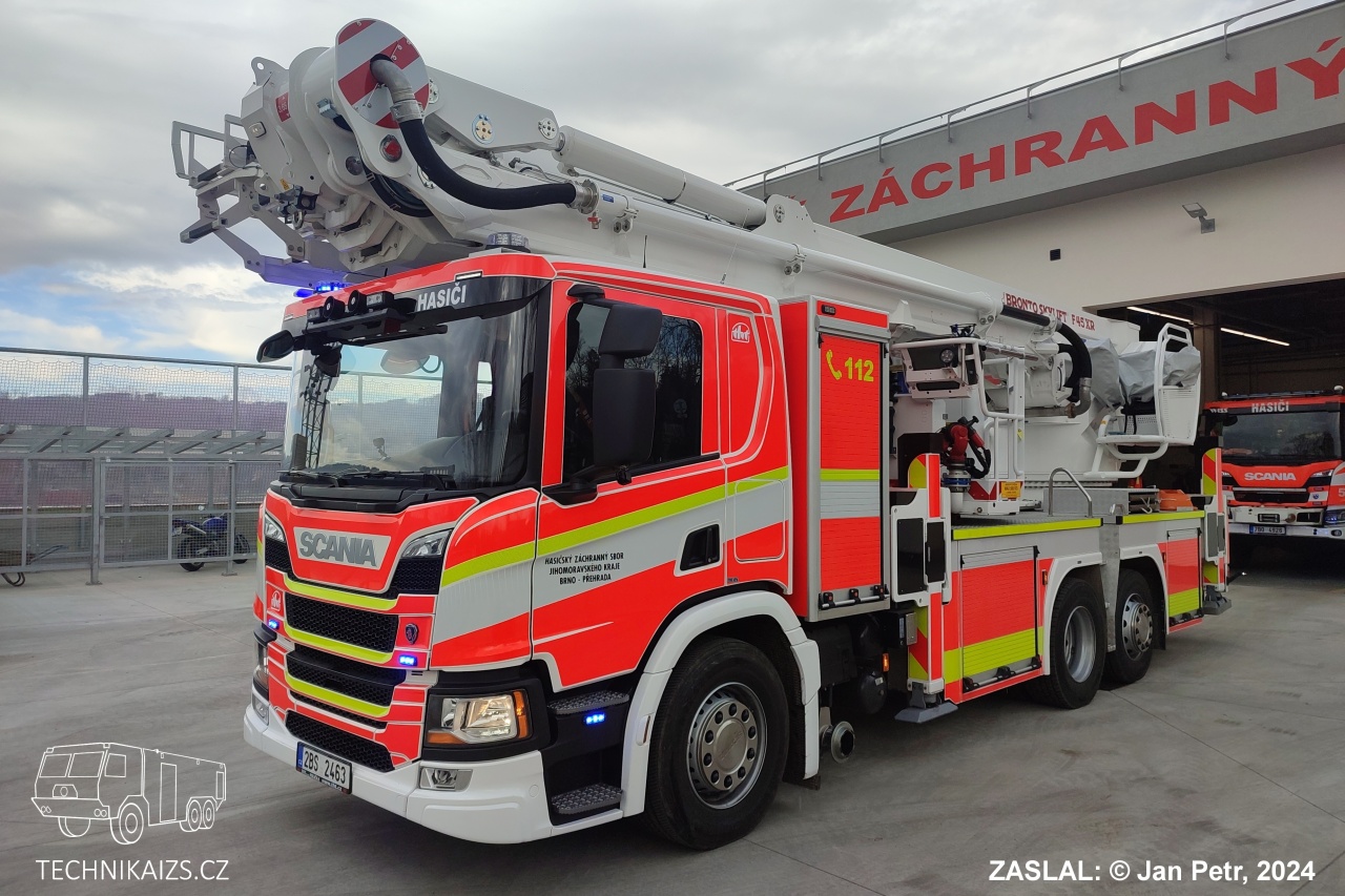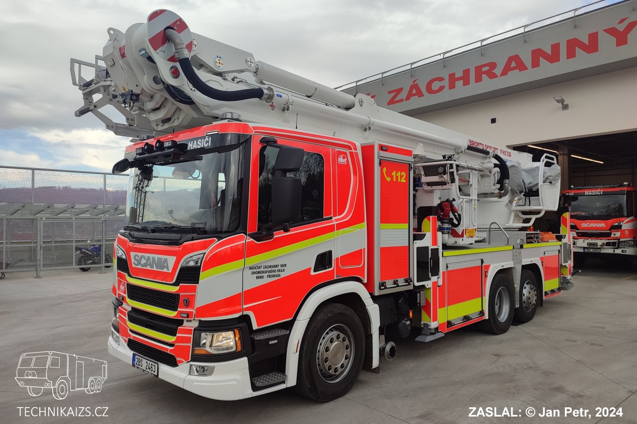 Doplňující info: HZS Jihomoravského kraje získalo v roce 2023 automobilovou plošinu na podvozku Scania P440 B6x2.4 se zadní řiditelnou nápravou ve zbarvení RAL 3024 s polepy pro zvýšení viditelnosti. Scania disponuje řadovým šestiválcem o výkonu 324 kW a převodovkou G33CM s retardérem a systémem Opticruise. Vozidlo je dlouhé 10,2m vysoké 3,65m a široké 2,5m. Celková cena byla 22 820 660 Kč včetně DPH. Plošina je vybavena sklopným ramenem o délce 12,5m, dále a je vybavena zařízením pro automatické rozložení a složení stabilizačních podpěr. Záchranný koš je pro max. 5 osob a maximální nosností 500 kg, pohyby ramen lze ovládat z hlavního ovládacího panelu a z ovládacího panelu v záchranném koši. Konstrukce záchranného koše umožňuje upevnění záchranných nosítek pro transport nepohyblivých osob s maximální hmotností 280 kg, nosítka je možné aretovat v libovolném pootočení podle svislé osy. Konstrukce dále umožňuje slaňování a použití záchranného evakuačního rukávu, proudnice je umístěna na vnější straně pracovního koše.