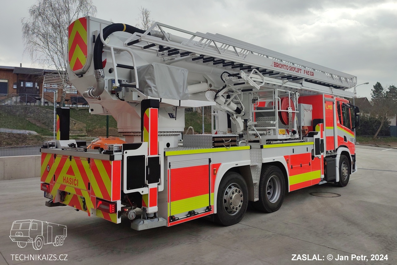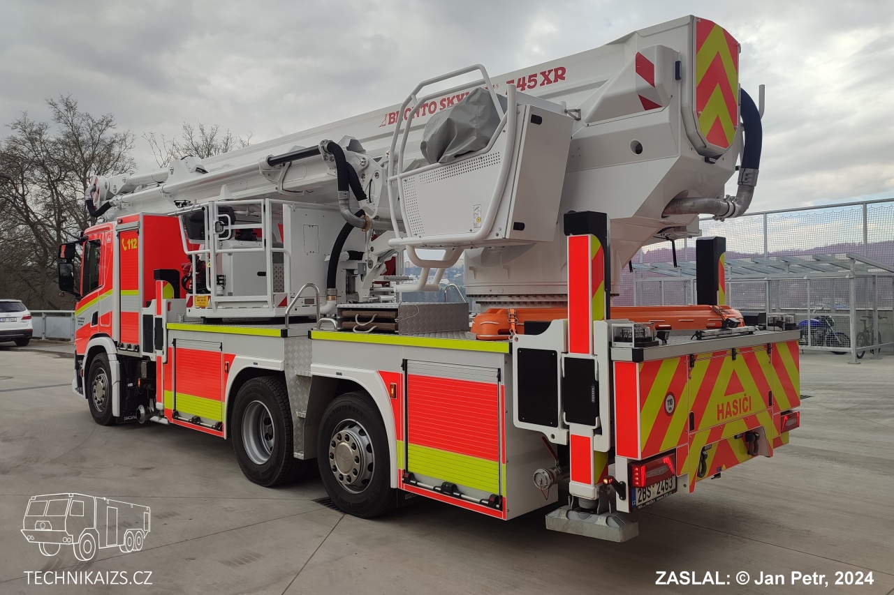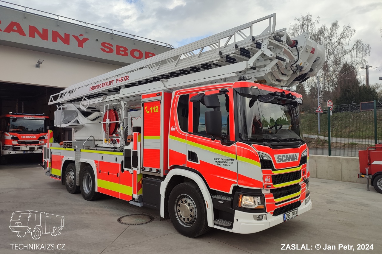 Doplňující info: HZS Jihomoravského kraje získalo v roce 2023 automobilovou plošinu na podvozku Scania P440 B6x2.4 se zadní řiditelnou nápravou ve zbarvení RAL 3024 s polepy pro zvýšení viditelnosti. Scania disponuje řadovým šestiválcem o výkonu 324 kW a převodovkou G33CM s retardérem a systémem Opticruise. Vozidlo je dlouhé 10,2m vysoké 3,65m a široké 2,5m. Celková cena byla 22 820 660 Kč včetně DPH. Plošina je vybavena sklopným ramenem o délce 12,5m, dále a je vybavena zařízením pro automatické rozložení a složení stabilizačních podpěr. Záchranný koš je pro max. 5 osob a maximální nosností 500 kg, pohyby ramen lze ovládat z hlavního ovládacího panelu a z ovládacího panelu v záchranném koši. Konstrukce záchranného koše umožňuje upevnění záchranných nosítek pro transport nepohyblivých osob s maximální hmotností 280 kg, nosítka je možné aretovat v libovolném pootočení podle svislé osy. Konstrukce dále umožňuje slaňování a použití záchranného evakuačního rukávu, proudnice je umístěna na vnější straně pracovního koše.