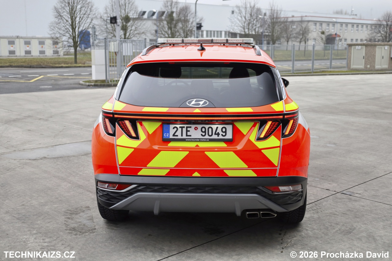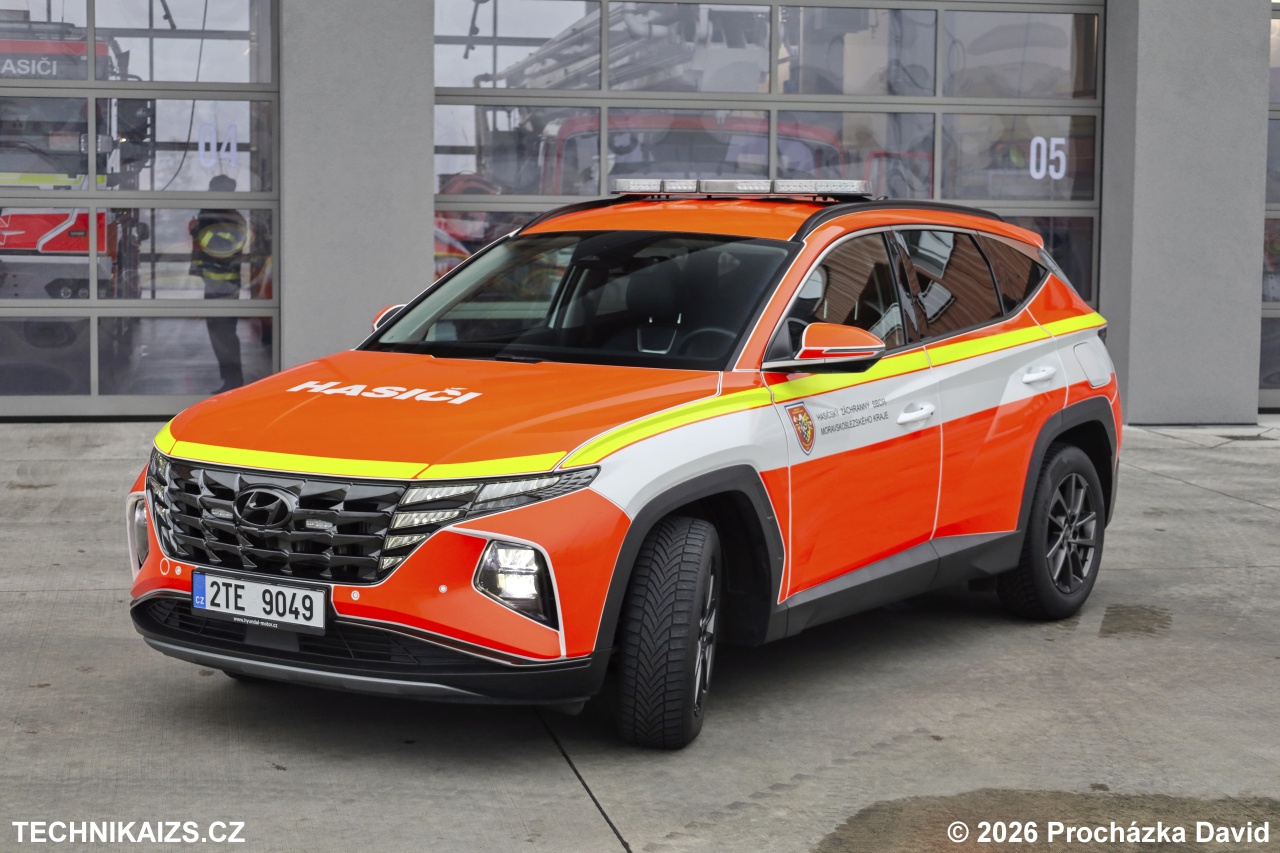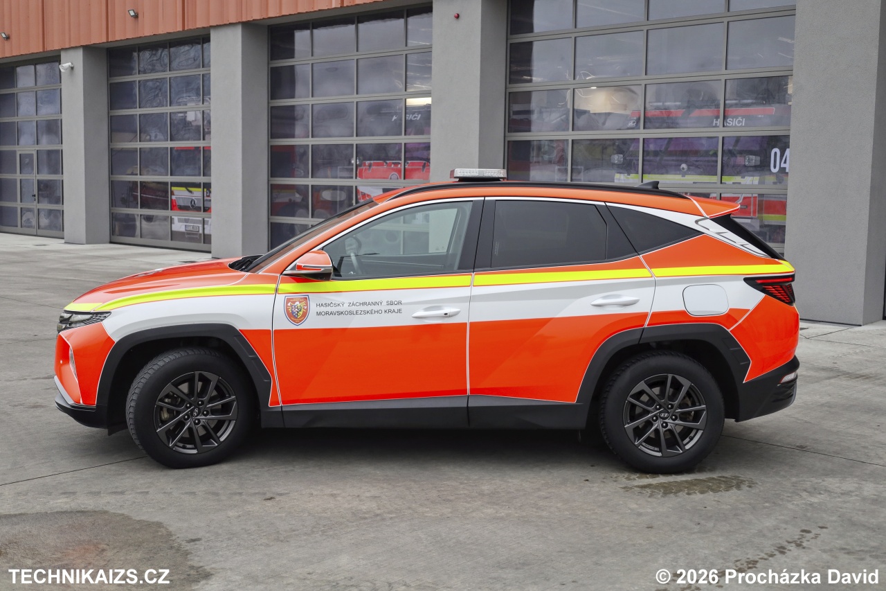 Doplňující info: Hasičský záchranný sbor Moravskoslezského kraje pořídil 24 nových velitelských automobilů Hyundai Tucson. Cena každého z automobilů je 639 980 korun, hodnota zakázky tedy činí 15 359 520 korun. Tucson je dodán ve verzi 1.6 T-GDi MHEW ve výbavě Style s paketem Premium. Původně bílý vůz je polepen do zářivě červeného odstínu RAL 3024 se zvýrazňujícími prvky v bílé a žlutozelené barvě, nechybí šrafování chevron. Automobil disponuje pohonem všech kol, sedmistupňová převodovka je samozřejmě automatická, dvouspojková. Řadit lze rovněž pádly pod volantem. Přeplňovaný benzinový čtyřválec dosahuje výkonu 132 kW při 5 500 otáčkách za minutu. Jeho maximální točivý moment je 265 Nm v rozsahu 1 500 až 4 500 otáček za minutu. Elektromotor je připojený na klikovou hřídel řemenem, palubní síť je zde 48voltová. Jeho úkolem je pomáhat při akceleraci a udržování volnoběžných otáček. Světelné výstražné zařízení je v červenomodré kombinaci v nejvyšší možné konfiguraci – rampa i přídavná světla tak vyzařují světla obou barev na obou polovinách automobilu. Reproduktor je zabudován za přední maskou. Digitální přístrojový panel je typu Supervision s 10,25″ barevným displejem, integruje navigaci i systémy Apple CarPlay či Android Auto. Nechybí bezdrátové nabíjení mobilního telefonu ani 360° kamerový systém.