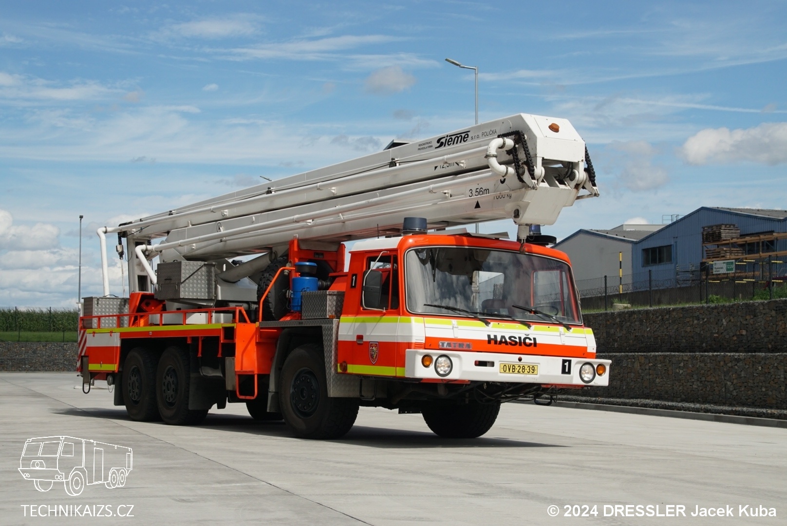 Doplňující info: Tatra 815 PJ 28 170 6×6.1 byla vyrobena v roce 1986 a na podzim roku 2014 prošla výraznou opravou. Největší část byla provedena na nástavbě. Nová je tak konstrukce zábradlí, vyměněny byly hydromotory otoče, dodány byly nové hliníkové skříně na vybavení, opraveno boční karosování a rovněž podlaha pracovního koše je vyrobena nová. Repasována byla lafetová proudnice, výměnou prošly vnitřky úložných prostor na obou stranách nástavby. Plošina byla po opravě olakována barvou v červeném odstínu RAL 3024, stabilizační podpěry navíc doplněny zvýrazňujícími pruhy. Elektrohydraulické ovládání umožňuje pohyby všech ramen i otáčení zároveň, plynulé rozjezdy a dojezdy bez rázů. Lafeta v kleci a osvětlení má možnost dálkového ovládání, na otoči je instalována hliníková schránka s elektrocentrálou s rozvodem 230/400 V.