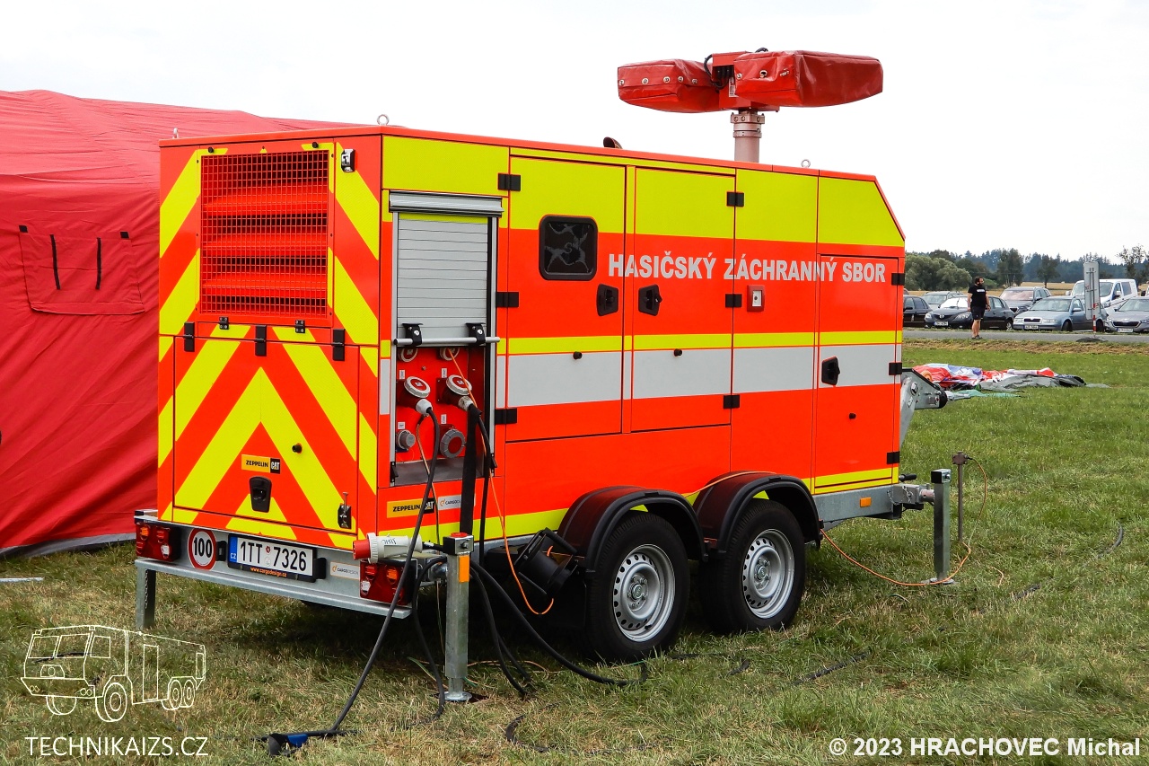 Doplňující info: Přívěs na míru vyrobeném dvounápravovém podvozku s dieselagregátem značky Caterpillar o výkonu 65 kVA a pneumaticky výsuvným stožárem 6,9 m nad úroveň terénu s šesti LED světly o výkonu 180 kW/ks a světelném toku 21 000 lumenů/ks. Cena pořízeného přívěsu byla 999 640 korun včetně DPH.