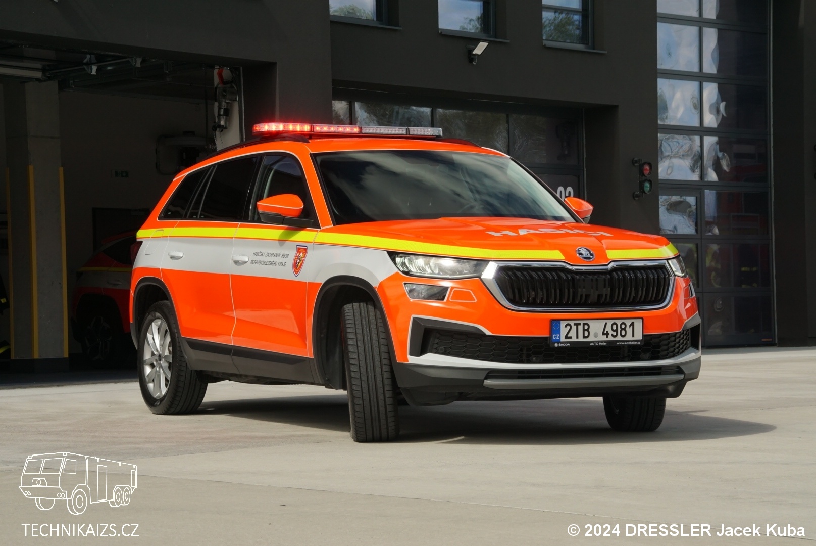 Doplňující info: Škoda Kodiaq ve výbavě Style je osazena dvoulitrovým vznětovým čtyřválcem o výkonu 140 kW, který je spřažen s automatickou sedmistupňovou dvouspojkovou převodovkou. Ta pohání všechna kola skrze samosvorný diferenciál se spojkou Haldex. Podvozek je adaptivní s nastavením tlumičů, převodovky a řízení v pěti režimech a funkcí Off Road. Vybaven je zesílenou ochranou spodní části motoru a kryty ramen zadní nápravy. Výstražné světelné zařízení modré barvy se skládá z majákové rampy a přídavných světel v masce, za zadním oknem a rovněž ve spodní hraně pátých dveří. Pro komunikaci slouží digitální terminál TPM700 a také výjezdový tablet. Na předním skle je uchycena kamera pro monitorování prostoru před vozidlem, záznam je fyzicky ukládán v automobilu a zároveň online přenášen na server krajského operačního střediska. Technické prostředky jsou uloženy v podlaze zavazadlového prostoru a na výsuvném platu. Kabina a zavazadlový prostor jsou odděleny mříži. Ve výbavě nechybí náhradní zásahový oděv a přilba, megafon, hasicí přístroj, variabilní ruční vyprošťovací nástroj ani ruční svítilny.