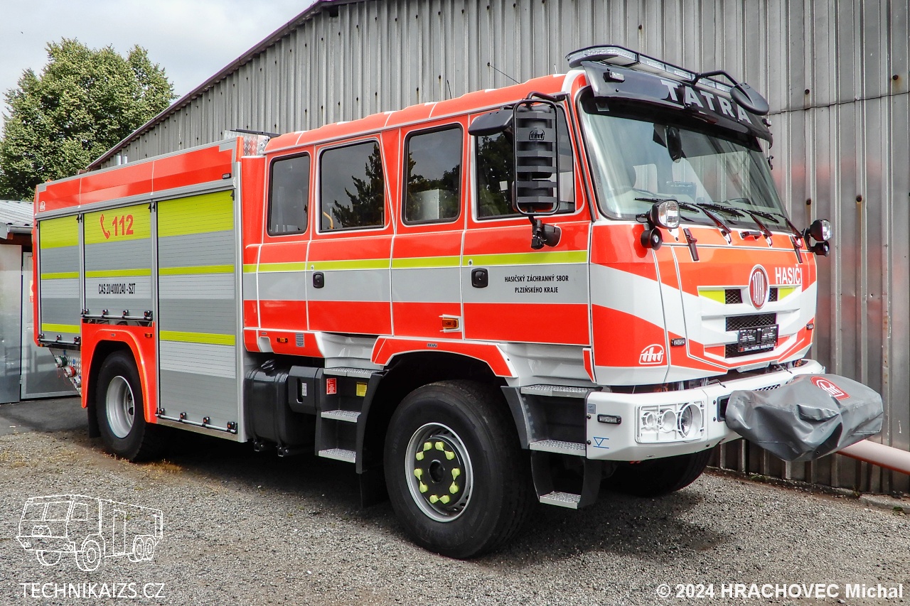 Doplňující info: Na stanici Horažďovice došlo k obměně prvovýjezdového vozidla, nahrazena tak byla CAS20 Tatra Terra z roku 2019 (v současné době CAS pro druhé družstvo na CHS Domažlice) vozem Tatra Terra z rámcové dodávky pro HZS ČR. Vozidlo je provedeno v odstínu RAL 3024 a se šrafováním Chevron, v hodnotě 8 799 725 korun včetně DPH. Obě nápravy jsou vybaveny stabilizátorem a uzávěrkou diferenciálu, pohon předních kol lze připojit dle potřeby. Všechna kola jsou osazena kotoučovými brzdami. Šestimístná kabina je vybavena centrálním zamykáním, klimatizací a nezávislým vytápěním, v opěradlech zadní řady sedadel a sedadla velitele jsou integrovány držáky dýchacích přístrojů. Karoserie účelové nástavby je vyrobena z profilů ze slitin lehkých kovů a olepena plechem. Nádrž na hasivo je z nerezavějící oceli, pojme 4 000 litrů vody a 240 litrů pěnidla. Čerpadlo THT PKA 2000–250 umožňuje zásah nízkým tlakem, vysokým tlakem, popřípadě kombinovaný provoz. Při jmenovitém tlaku 10 barů dosahuje výkonu 2 000 litrů za minutu. Čerpací zařízení je spolu s nástavbou ovládáno 10″ dotykovým terminálem v zadní části vozu nebo 7″ přenosným tabletem umístěným v kabině řidiče. Mezi kabinou a nástavbou je uchycen pneumaticky výsuvný osvětlovací stožár s 24V LED reflektory. Vybaven je funkcí samočinného složení do parkovací polohy, napájení zajišťuje elektrická soustava podvozku. Cisterna je osazena VRZ v modro-červené barvě.