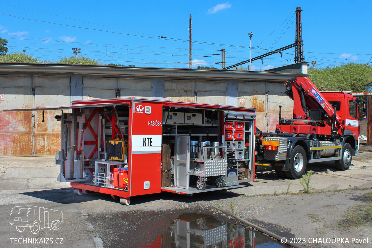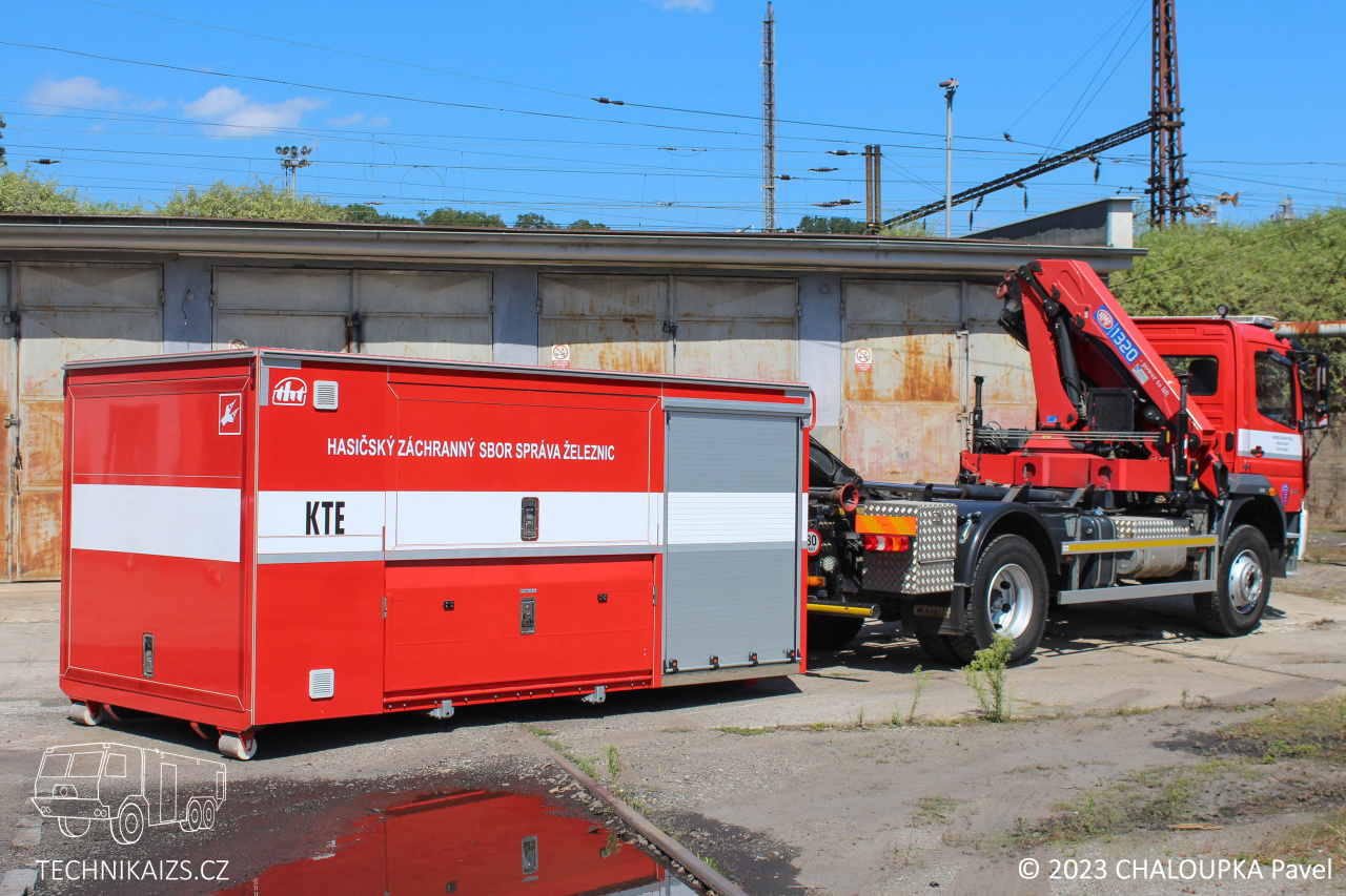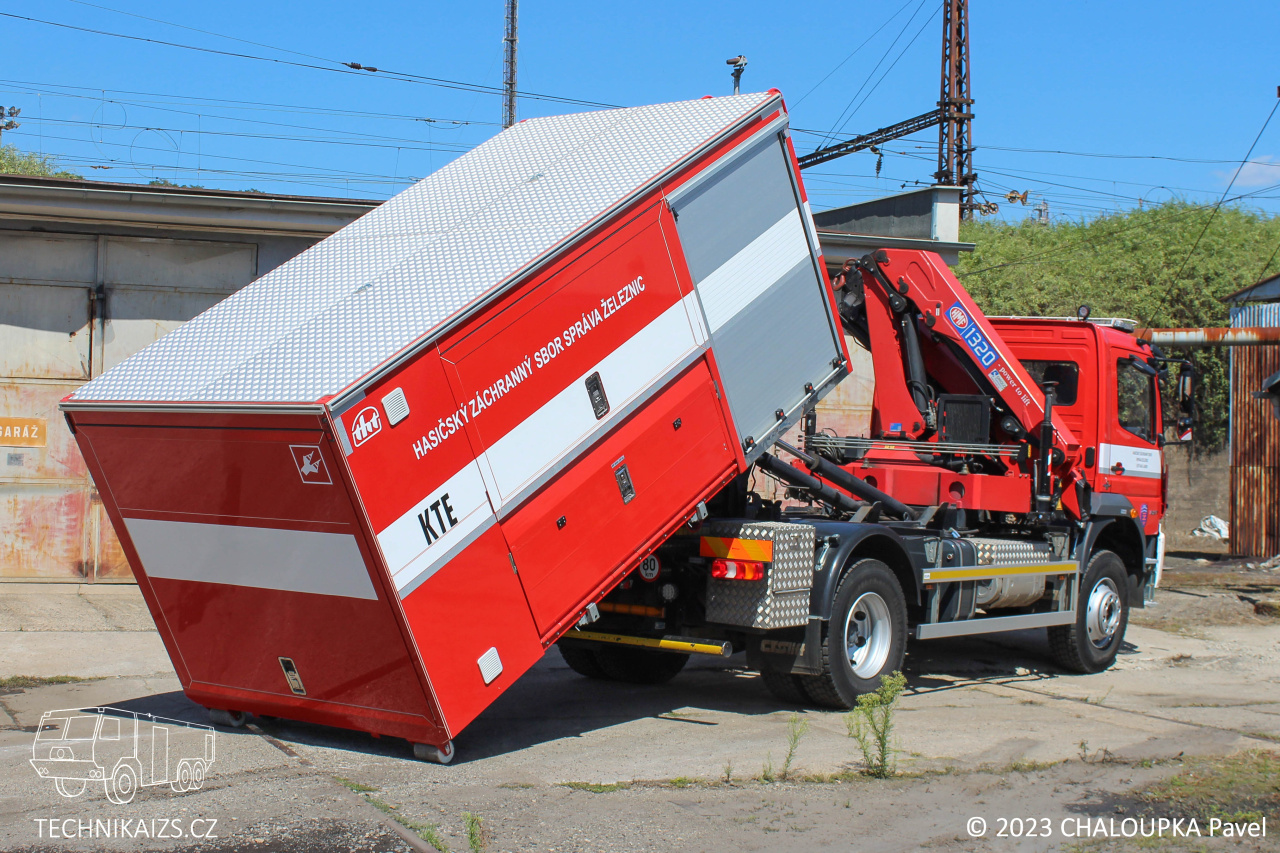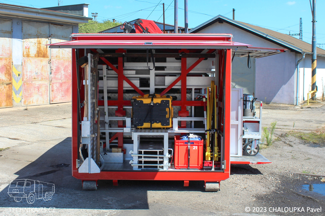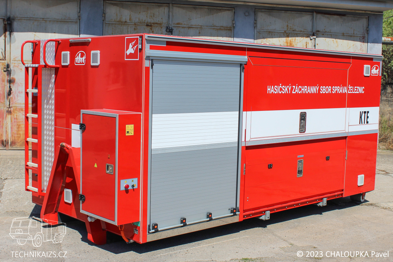 Doplňující info: Technický kontejner je projektován pro uložení prostředků, manipulaci a přepravu věcných prostředků požární ochrany a požárního příslušenství určených pro činnosti při mimořádných událostech. Konstrukci kontejneru tvoří svařenec ocelového rámu z oceli a nosného rámu umožňující manipulaci a převoz pomocí nákladního vozu vybaveného hákovým mechanismem. Rám je opláštěn oboustranně pozinkovaným plechem z oceli nebo lehkého kovu. Podlaha kontejneru je provedena z voděodolné překližky nebo lehkého kovu s dostatečnou únosností. První část (směrem od přední části kontejneru) je z obou boků opatřena uzavíracími roletami s průběžnými madly přes celou šířku rolety, druhá část je zpřístupněna dvoudílnými vyztuženými dveřmi výklopnými směrem nahoru a třetí část je z obou boků pevná, zakrytá plechem a je přístupná zezadu, zadní část kontejneru je zpřístupněna jednodílnými vyztuženými dveřmi výklopnými směrem nahoru. Střecha kontejneru je pochozí, z hliníkového profilovaného plechu, přístup je zajištěn žebříkem. Kontejner je dále vybaven výsuvným platem a dvěma vozíky. Mezi vybavení technického kontejneru patří nakolejovací sada, pneumatická stabilizační sada – Paratech, motorová a rozbrusovací pila, čtveřice hasících přístrojů, kolejový vozík, evakuační lávka, kufr s nářadím, elektrocentrála, osvětlovací balon, rozkládací přístřešek, lavice a stolky, ruční nářadí, řetězové úvazky, klíny na stabilizaci, úkapové vany a tlaková láhev k dýchacímu přístroji.