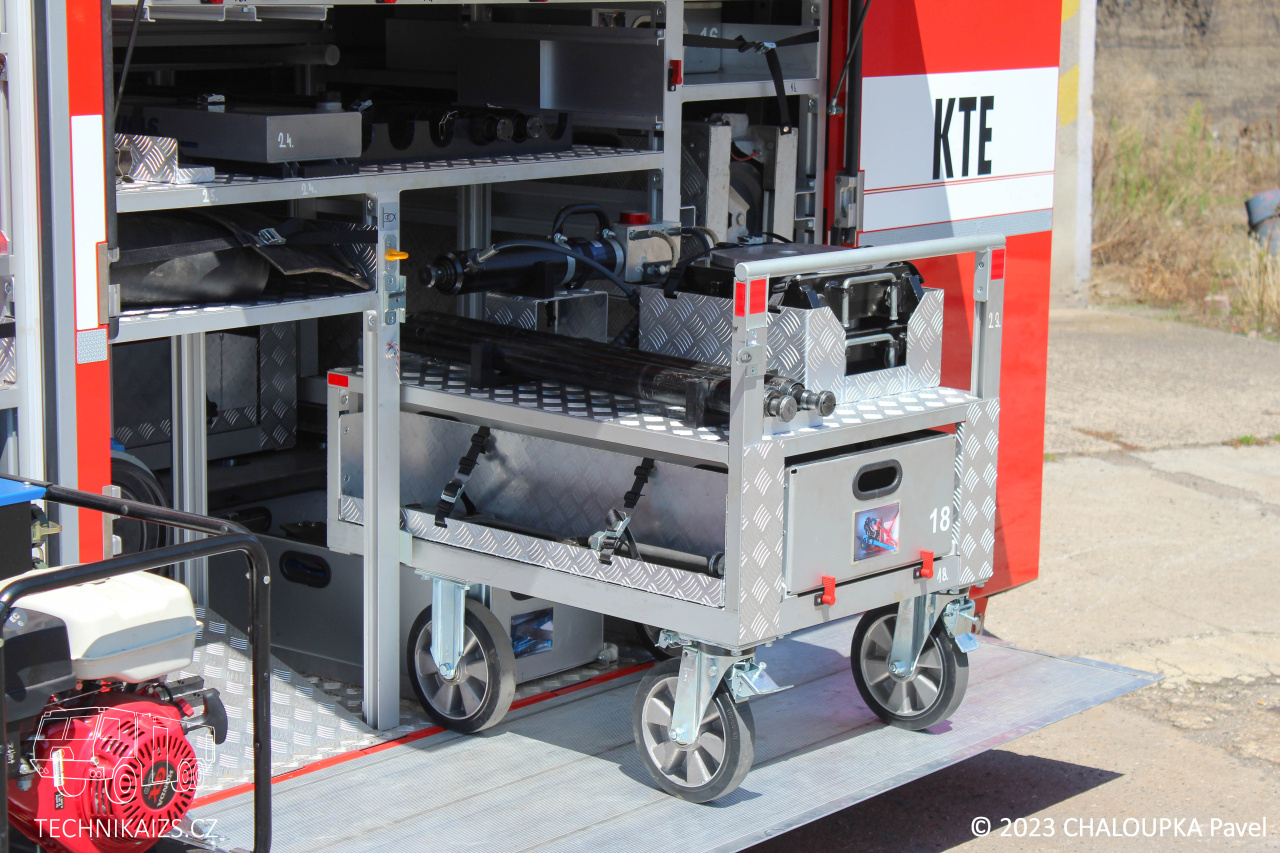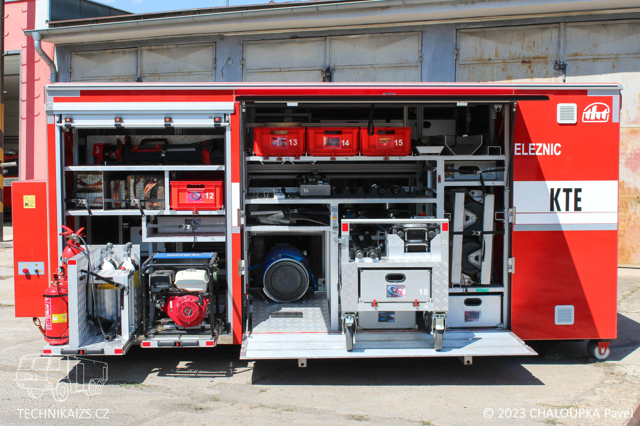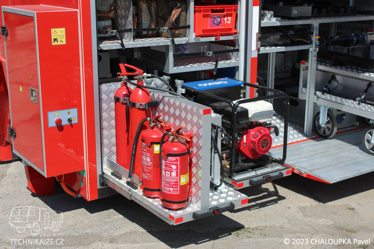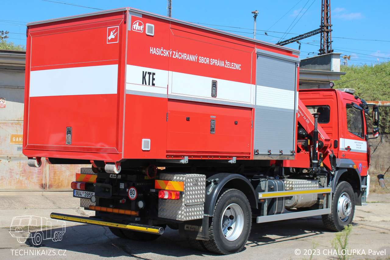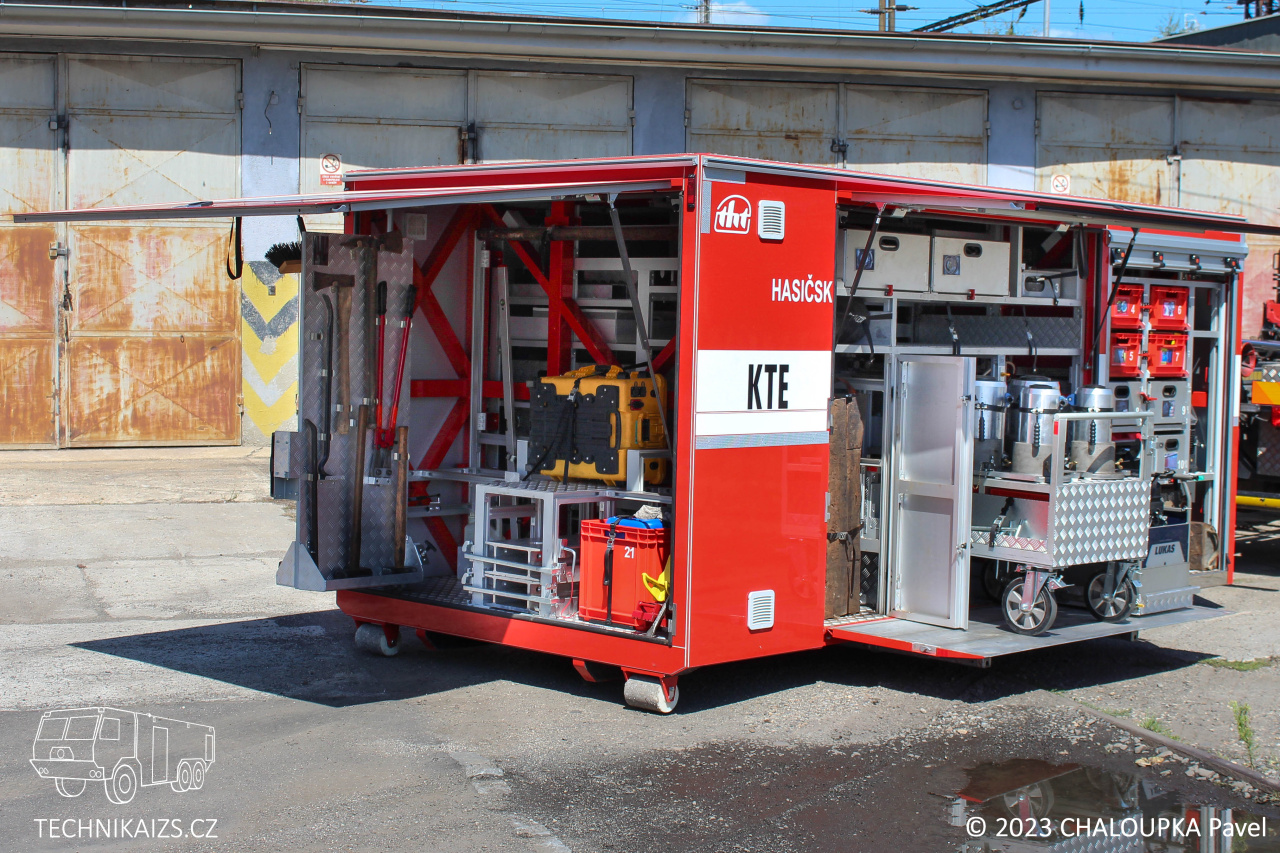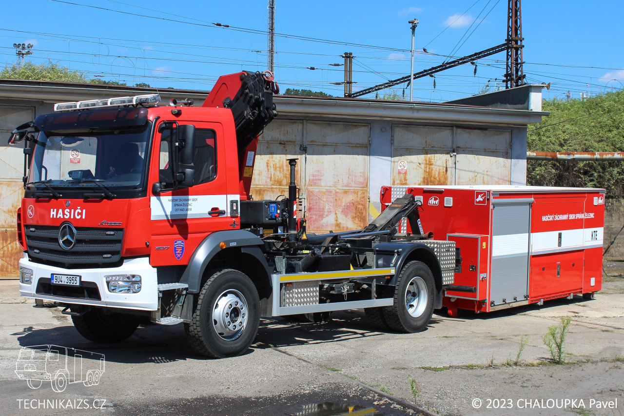 Doplňující info: Technický kontejner je projektován pro uložení prostředků, manipulaci a přepravu věcných prostředků požární ochrany a požárního příslušenství určených pro činnosti při mimořádných událostech. Konstrukci kontejneru tvoří svařenec ocelového rámu z oceli a nosného rámu umožňující manipulaci a převoz pomocí nákladního vozu vybaveného hákovým mechanismem. Rám je opláštěn oboustranně pozinkovaným plechem z oceli nebo lehkého kovu. Podlaha kontejneru je provedena z voděodolné překližky nebo lehkého kovu s dostatečnou únosností. První část (směrem od přední části kontejneru) je z obou boků opatřena uzavíracími roletami s průběžnými madly přes celou šířku rolety, druhá část je zpřístupněna dvoudílnými vyztuženými dveřmi výklopnými směrem nahoru a třetí část je z obou boků pevná, zakrytá plechem a je přístupná zezadu, zadní část kontejneru je zpřístupněna jednodílnými vyztuženými dveřmi výklopnými směrem nahoru. Střecha kontejneru je pochozí, z hliníkového profilovaného plechu, přístup je zajištěn žebříkem. Kontejner je dále vybaven výsuvným platem a dvěma vozíky. Mezi vybavení technického kontejneru patří nakolejovací sada, pneumatická stabilizační sada – Paratech, motorová a rozbrusovací pila, čtveřice hasících přístrojů, kolejový vozík, evakuační lávka, kufr s nářadím, elektrocentrála, osvětlovací balon, rozkládací přístřešek, lavice a stolky, ruční nářadí, řetězové úvazky, klíny na stabilizaci, úkapové vany a tlaková láhev k dýchacímu přístroji.