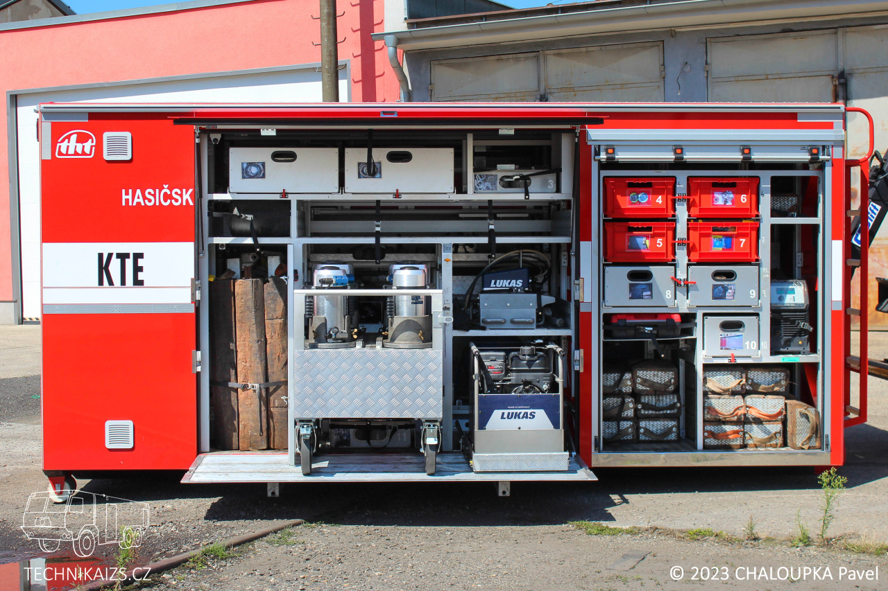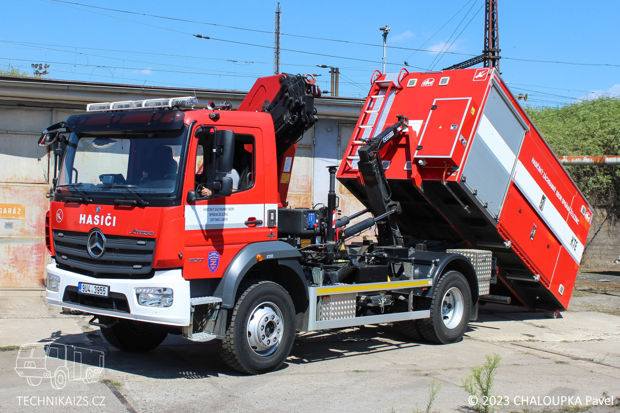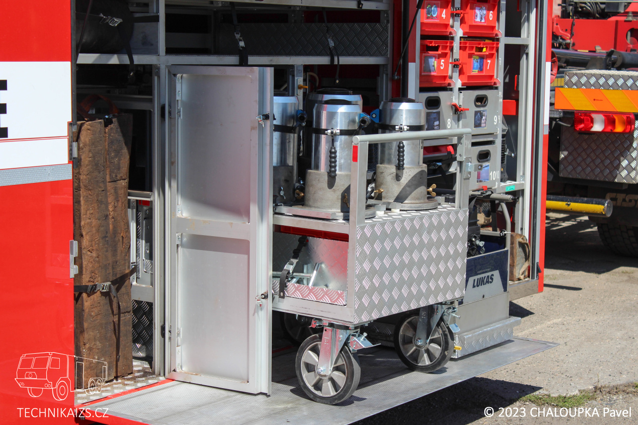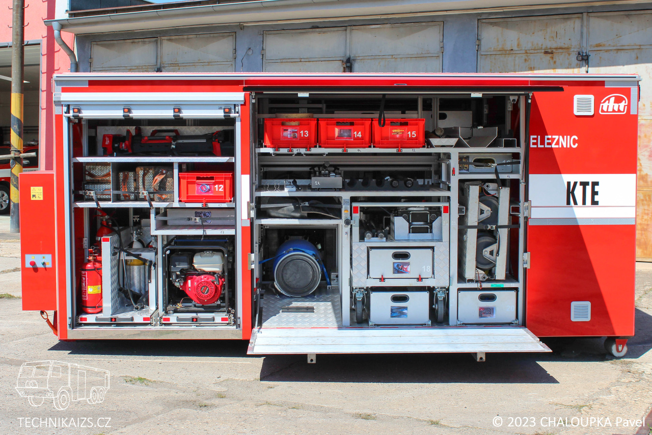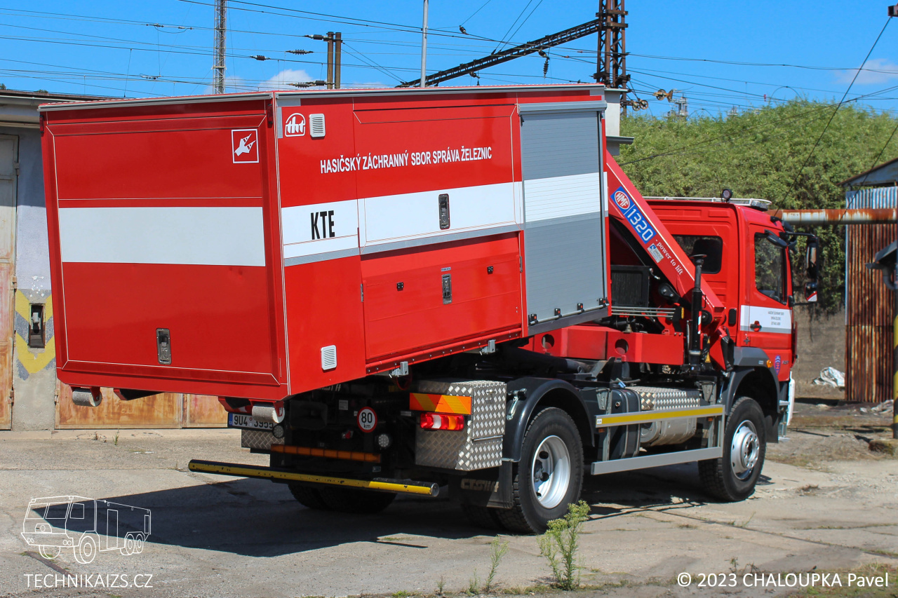 Doplňující info: Technický kontejner je projektován pro uložení prostředků, manipulaci a přepravu věcných prostředků požární ochrany a požárního příslušenství určených pro činnosti při mimořádných událostech. Konstrukci kontejneru tvoří svařenec ocelového rámu z oceli a nosného rámu umožňující manipulaci a převoz pomocí nákladního vozu vybaveného hákovým mechanismem. Rám je opláštěn oboustranně pozinkovaným plechem z oceli nebo lehkého kovu. Podlaha kontejneru je provedena z voděodolné překližky nebo lehkého kovu s dostatečnou únosností. První část (směrem od přední části kontejneru) je z obou boků opatřena uzavíracími roletami s průběžnými madly přes celou šířku rolety, druhá část je zpřístupněna dvoudílnými vyztuženými dveřmi výklopnými směrem nahoru a třetí část je z obou boků pevná, zakrytá plechem a je přístupná zezadu, zadní část kontejneru je zpřístupněna jednodílnými vyztuženými dveřmi výklopnými směrem nahoru. Střecha kontejneru je pochozí, z hliníkového profilovaného plechu, přístup je zajištěn žebříkem. Kontejner je dále vybaven výsuvným platem a dvěma vozíky. Mezi vybavení technického kontejneru patří nakolejovací sada, pneumatická stabilizační sada – Paratech, motorová a rozbrusovací pila, čtveřice hasících přístrojů, kolejový vozík, evakuační lávka, kufr s nářadím, elektrocentrála, osvětlovací balon, rozkládací přístřešek, lavice a stolky, ruční nářadí, řetězové úvazky, klíny na stabilizaci, úkapové vany a tlaková láhev k dýchacímu přístroji.