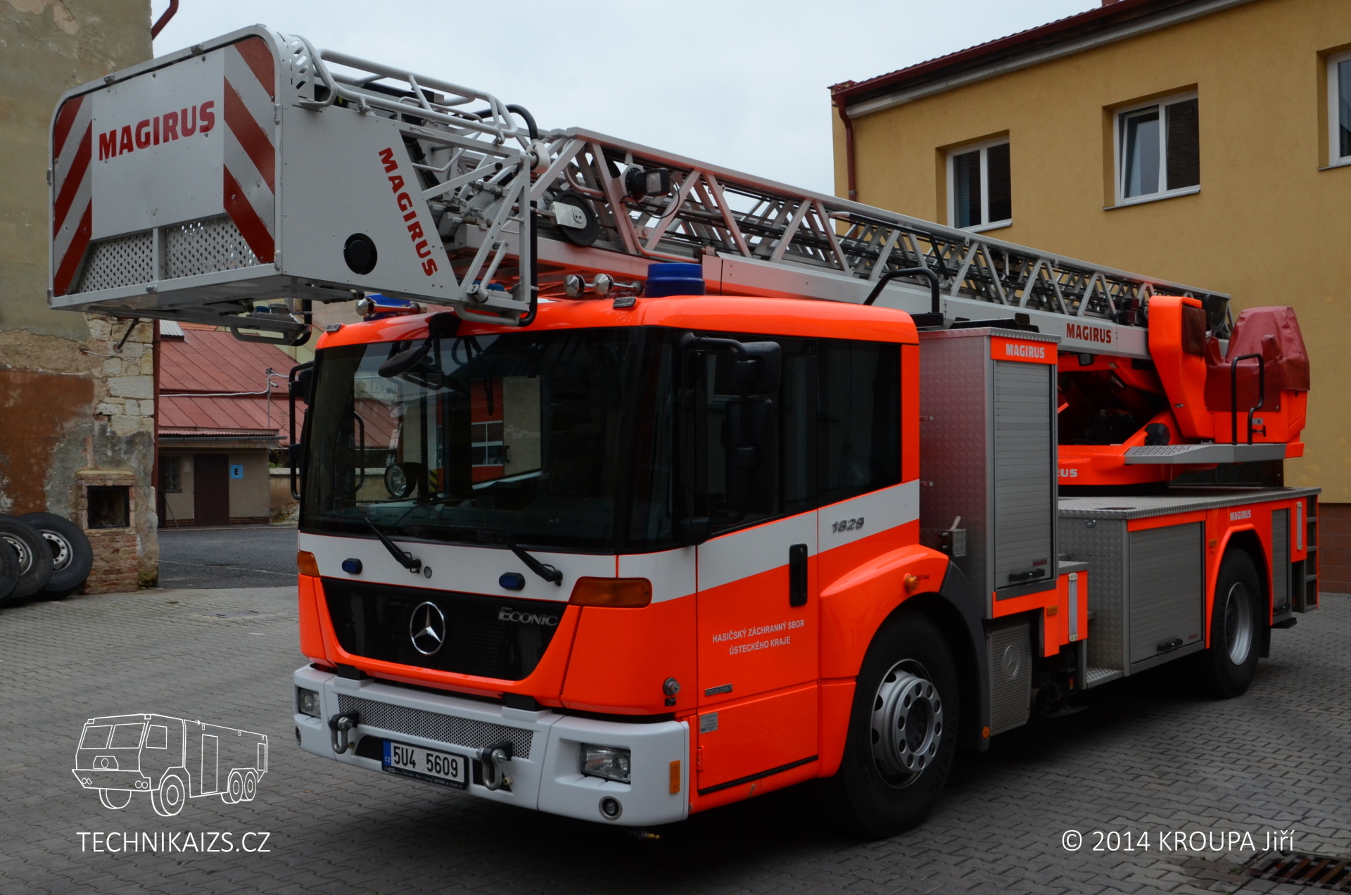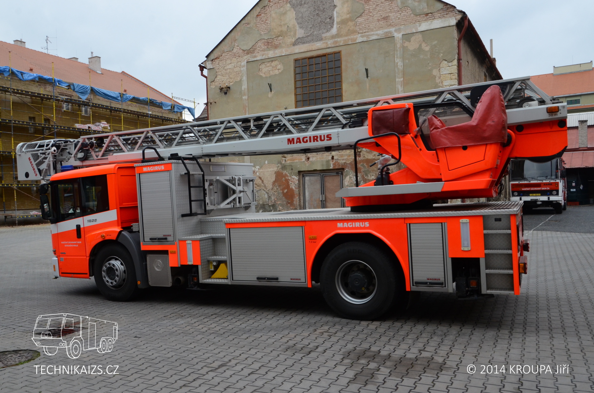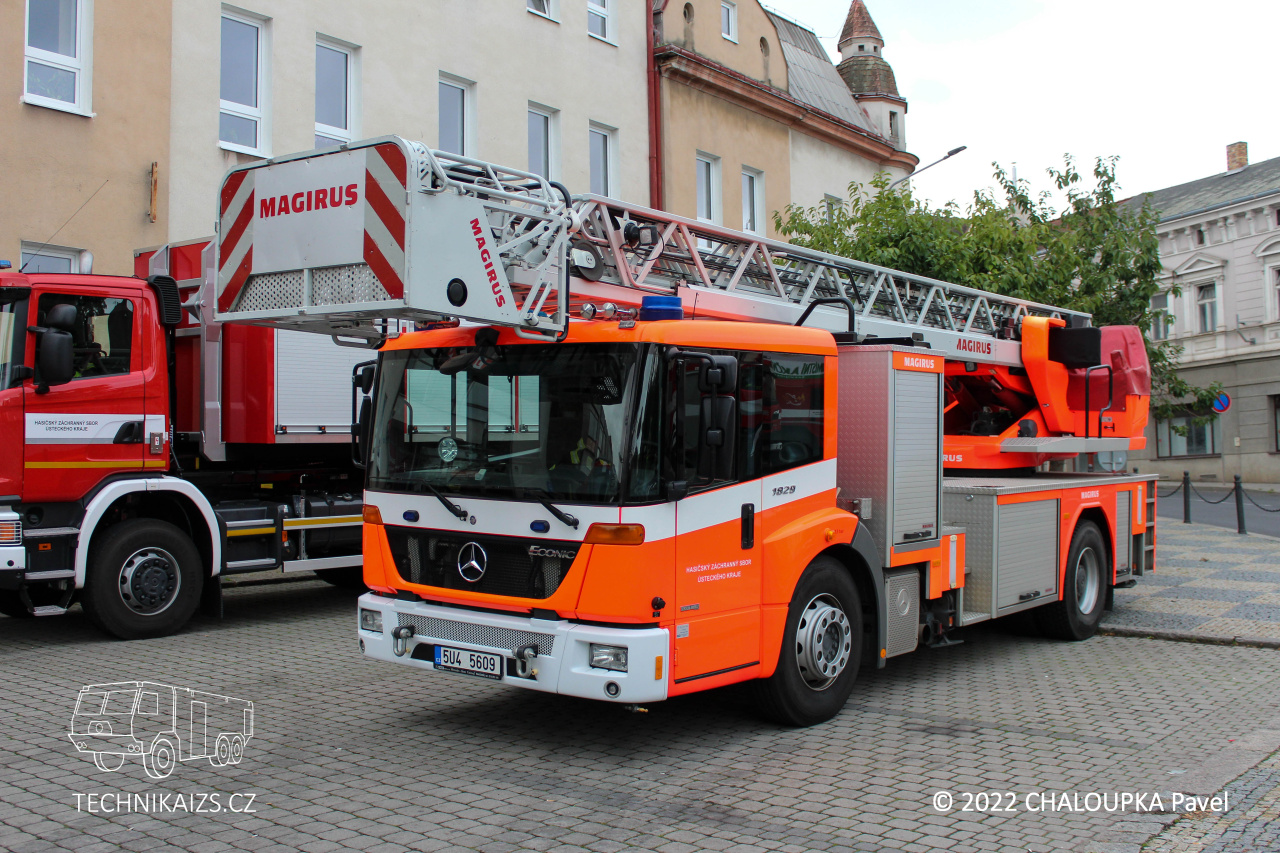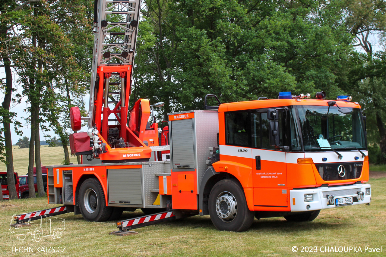 Doplňující info: Automobil je postaven na dvounápravovém podvozku Mercedes-Benz Econic 1829 LL. Pohání ho naftový, přeplňovaný šestiválec o výkonu 210 kW, o převody se pak stará automatická převodovka. Kabina je u této varianty Econicu snížená, předsunutá, určená pro trojčlennou osádku. Maximální rychlost automobilu je elektronicky omezena na 90 km/h. Nástavba je zhotovena z hliníkových profilů a na každé straně nabízí trojici skříní pro vybavení, krytou hliníkovými roletkami. Najdeme v nich například lana, hadice, reflektory s prodlužovacími kabely, podkládací desky apod. Žebříková sada je typu Vario CS, je tedy stabilizována čtyřmi výsuvnými podpěrami do „A“. Pneumatiky vozu zůstávají při stabilizaci stále ve styku s podložkou, pérování zadních náprav je aretováno. Při různých šířkách podepření dochází k automatickému omezení maximální hodnoty vyložení, dle zásahu řídícího počítače. Ustavené vozidlo s nimi může dosahovat šířky od 2400 mm do 5200 mm a podpěry dokáží kompenzovat rozdíl výšky pod jednotlivými packami až do 700 mm. Každá z nich je ovládána samostatně, což umožňuje dobrou manipulaci i v omezených prostorech. Sada je ovládána hydraulicky a umožňuje nekonečné otáčení. Záchranná výška žebříku je 30 metrů, dostupná pak samozřejmě 32 metrů. Jmenovitá výška je 23 metrů při jmenovitém vyložení 12 metrů (odtud německé označení DLK 23–12). Záchranný koš je typu RK 270. Jeho maximální nosné zatížení je tedy 190 kg, což odpovídá třem osobám. Užitná plocha podlahy koše je 0,9 m2. Do koše je možno uchytit také běžné příslušenství – například sklopný a otočný monitor nebo záchranná nosítka. Voda je dodávána teleskopickým suchovodem, který je instalován na sadě.