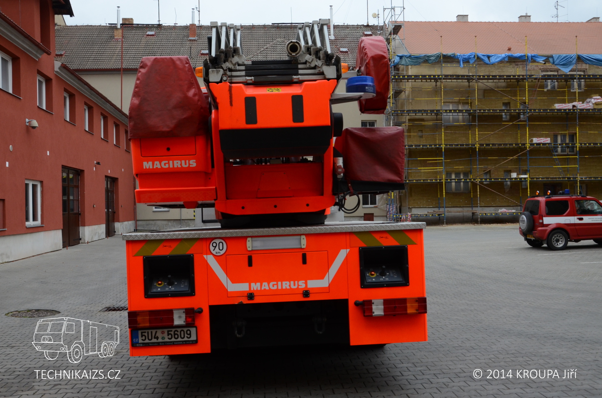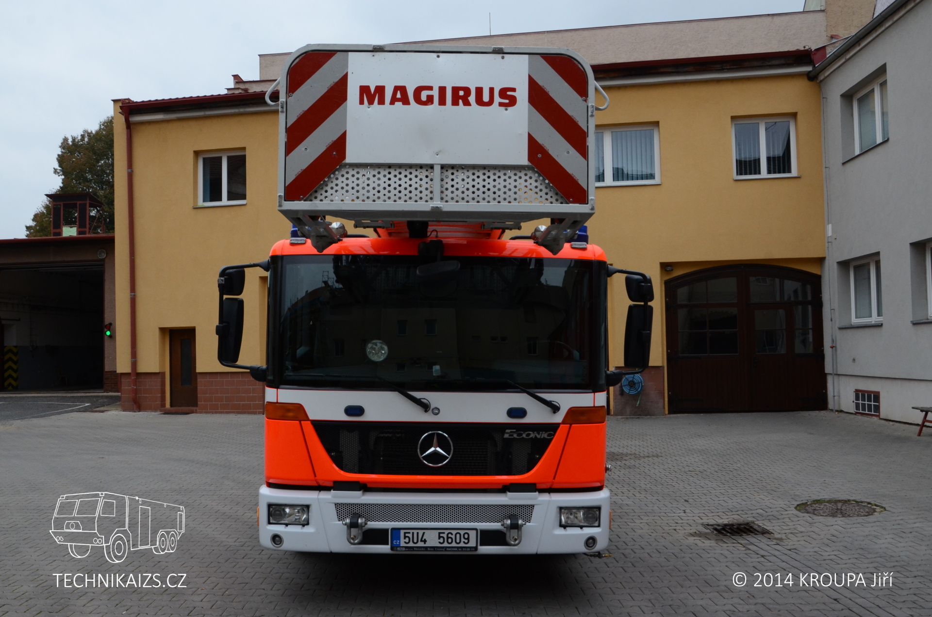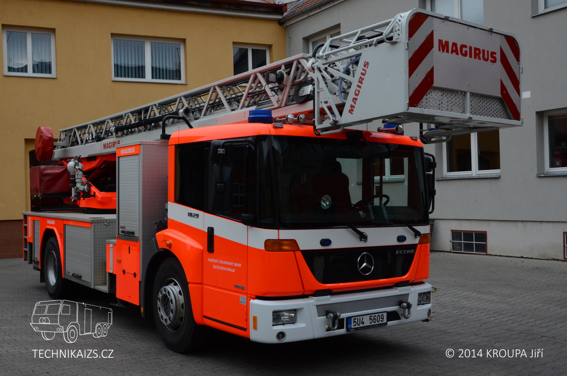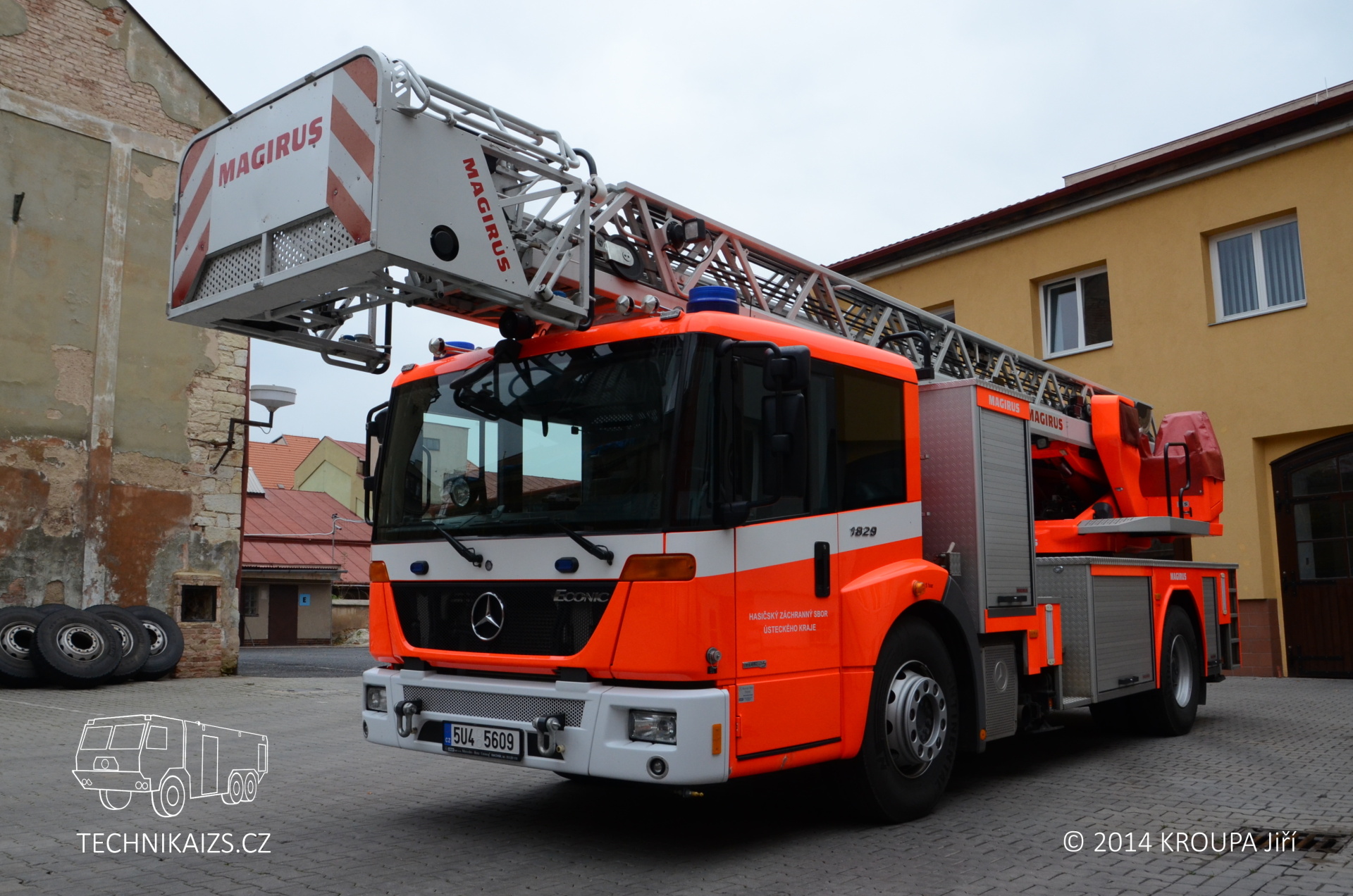 Doplňující info: Automobil je postaven na dvounápravovém podvozku Mercedes-Benz Econic 1829 LL. Pohání ho naftový, přeplňovaný šestiválec o výkonu 210 kW, o převody se pak stará automatická převodovka. Kabina je u této varianty Econicu snížená, předsunutá, určená pro trojčlennou osádku. Maximální rychlost automobilu je elektronicky omezena na 90 km/h. Nástavba je zhotovena z hliníkových profilů a na každé straně nabízí trojici skříní pro vybavení, krytou hliníkovými roletkami. Najdeme v nich například lana, hadice, reflektory s prodlužovacími kabely, podkládací desky apod. Žebříková sada je typu Vario CS, je tedy stabilizována čtyřmi výsuvnými podpěrami do „A“. Pneumatiky vozu zůstávají při stabilizaci stále ve styku s podložkou, pérování zadních náprav je aretováno. Při různých šířkách podepření dochází k automatickému omezení maximální hodnoty vyložení, dle zásahu řídícího počítače. Ustavené vozidlo s nimi může dosahovat šířky od 2400 mm do 5200 mm a podpěry dokáží kompenzovat rozdíl výšky pod jednotlivými packami až do 700 mm. Každá z nich je ovládána samostatně, což umožňuje dobrou manipulaci i v omezených prostorech. Sada je ovládána hydraulicky a umožňuje nekonečné otáčení. Záchranná výška žebříku je 30 metrů, dostupná pak samozřejmě 32 metrů. Jmenovitá výška je 23 metrů při jmenovitém vyložení 12 metrů (odtud německé označení DLK 23–12). Záchranný koš je typu RK 270. Jeho maximální nosné zatížení je tedy 190 kg, což odpovídá třem osobám. Užitná plocha podlahy koše je 0,9 m2. Do koše je možno uchytit také běžné příslušenství – například sklopný a otočný monitor nebo záchranná nosítka. Voda je dodávána teleskopickým suchovodem, který je instalován na sadě.