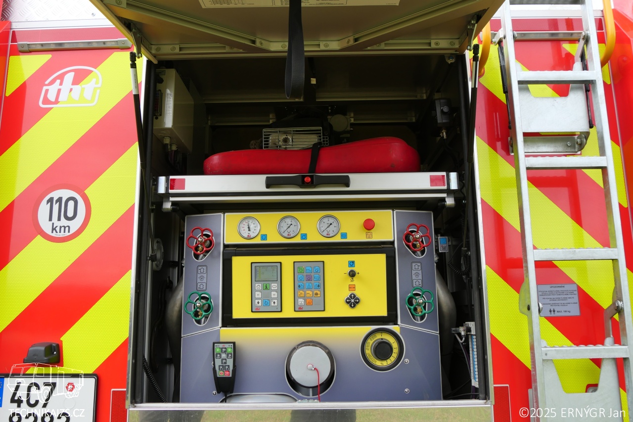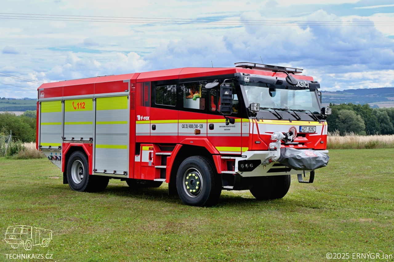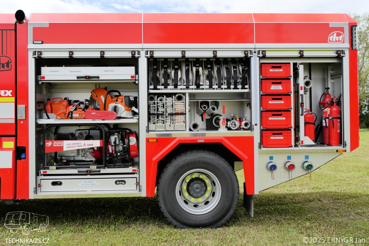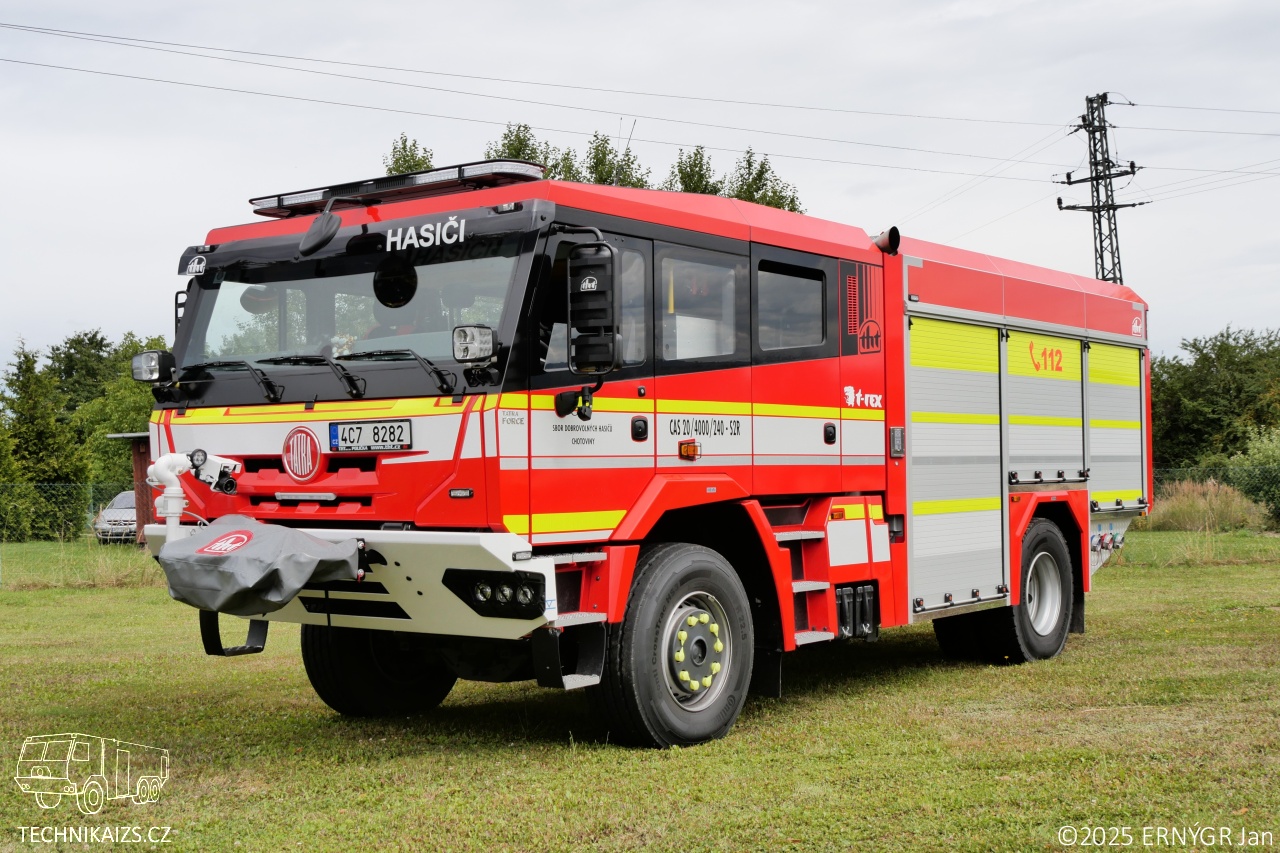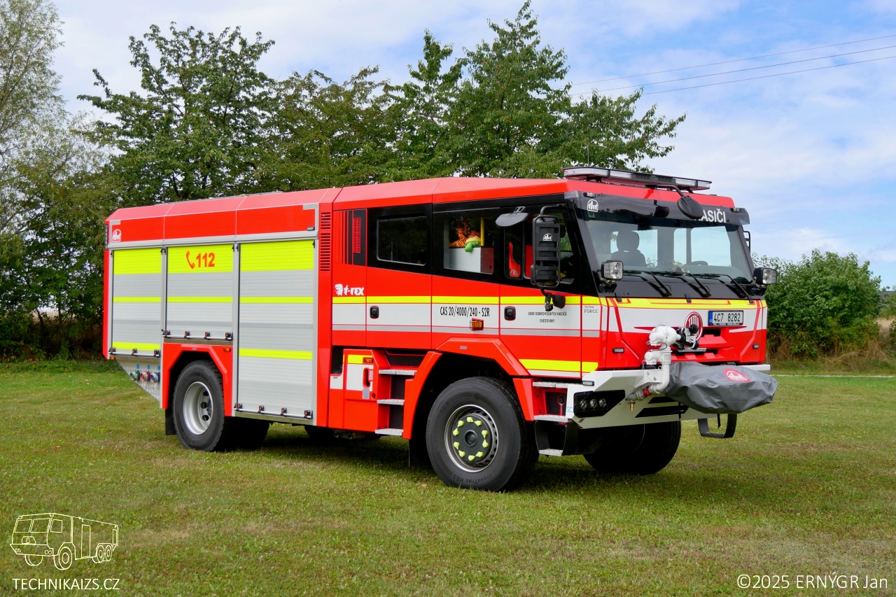 Doplňující info: Tatra je vybavena osmiválcovým vzduchem chlazeným motorem o výkonu 340 kW a převodovkou Allison. Vozidlo je vybaveno retardérem v elektromagnetickém provedení. Přední náprava je řídící, vybavená uzávěrkou osového diferenciálu zapínatelnou dle potřeby. Pohon na kola je proveden z rozvodovky hřídeli s homokinetickými klouby. Kyvadlové polonápravy jsou odpruženy vzduchovými vlnovcovými pružinami a teleskopickými tlumiči pérování. Zadní náprava je osazena čelním diferenciálem s uzávěrkou, která je rovněž zapínatelná dle potřeby. Kyvadlové polonápravy jsou odpruženy kombinací vzduchových vlnovcových a vinutých pružin. Tlumiče pérování jsou teleskopické. Tlak ve vlnovcových pružinách se mění pomocí regulačního ventilu v závislosti na zatížení zadní polonápravy, přičemž je zachován stálý odklon. Ovládáním v kabině řidiče lze regulací tlaku vzduchu ve vlnovcových pružinách měnit výšku vozidla vůči provozní výšce. Nástavba je vyrobena z profilů ze slitin lehkých kovů s použitím prizmatických šroubovaných spojů a olepena plechem. Nádrž na vodu a pěnidlo tvoří jeden celek, uveze celkem 4000 litrů vody a 240 litrů pěnidla. CAS je dále vybavena systémem řízení provozu účelové nástavby, který umožňuje monitorování a ovládání jejích prvků. Osvětlení okolí vozidla zajišťují LED lišty umístěné na obou bocích a v zadní části nástavby, doplněné o LED stavoznaky. V dosahu sedadla řidiče je uchycen tablet, který slouží k ovládání a monitorování funkcí CAS. Pro ochranu a odolnost vozidla jsou zpětná zrcátka opatřena kovovými kryty. Pro hašení je CAS vybavena lafetovou proudnicí na předním nárazníku. Celková cena vozidla činí 9 556 247 Kč včetně DPH.