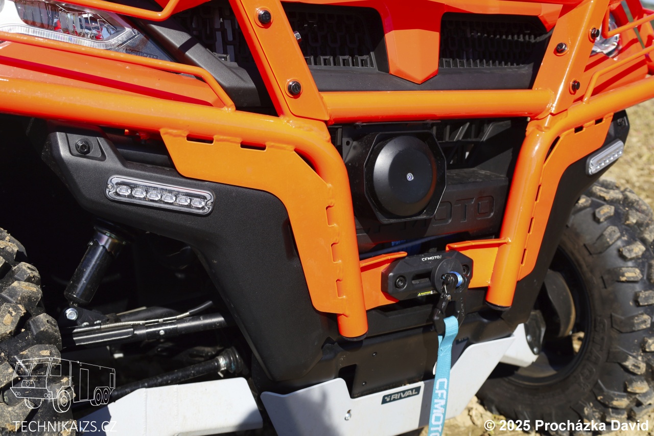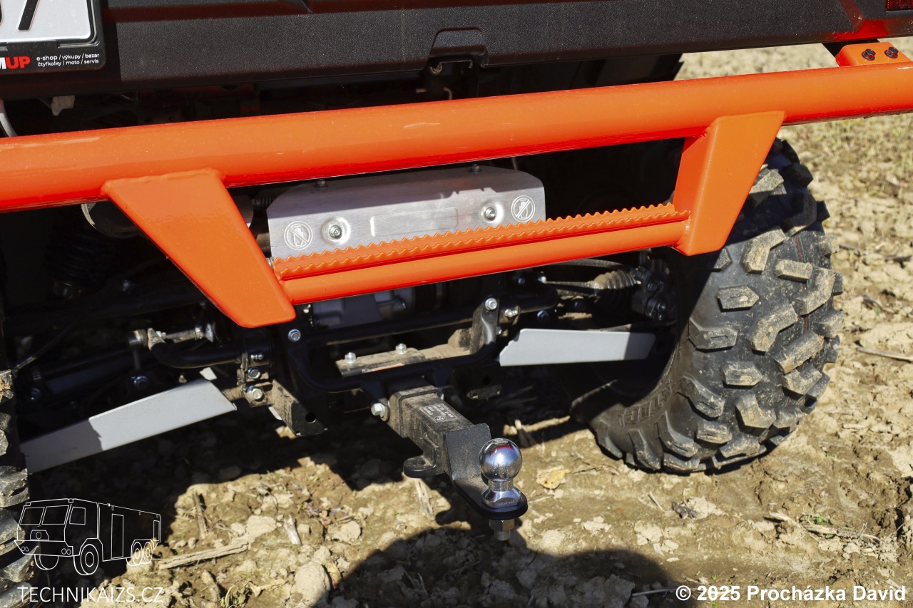 Pro praktické využití je čtyřkolka vybavena prostornou sklopnou korbou z odlehčeného, ale odolného plastu, opatřenou praktickými oky a homologovanou nosností 365 kg. Dále disponuje homologovanou tažnou silou 520 kg a zvýšenou ochranou podvozku, která přispívá k bezpečnému provozu i v extrémních podmínkách. Nechybí ani elektrický naviják s tažnou silou 1,5 tuny, vodicími rolnami a dálkovým ovládáním.