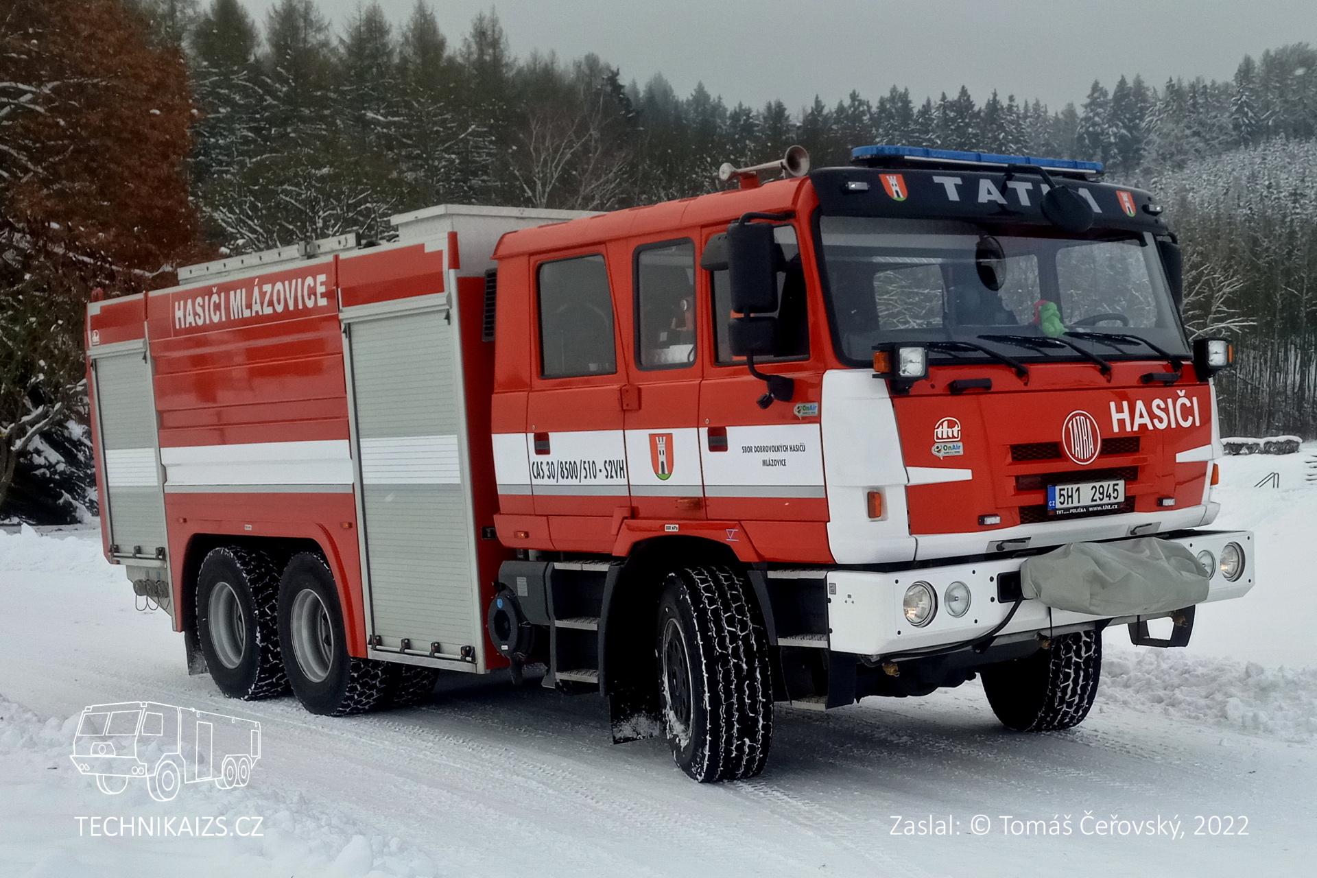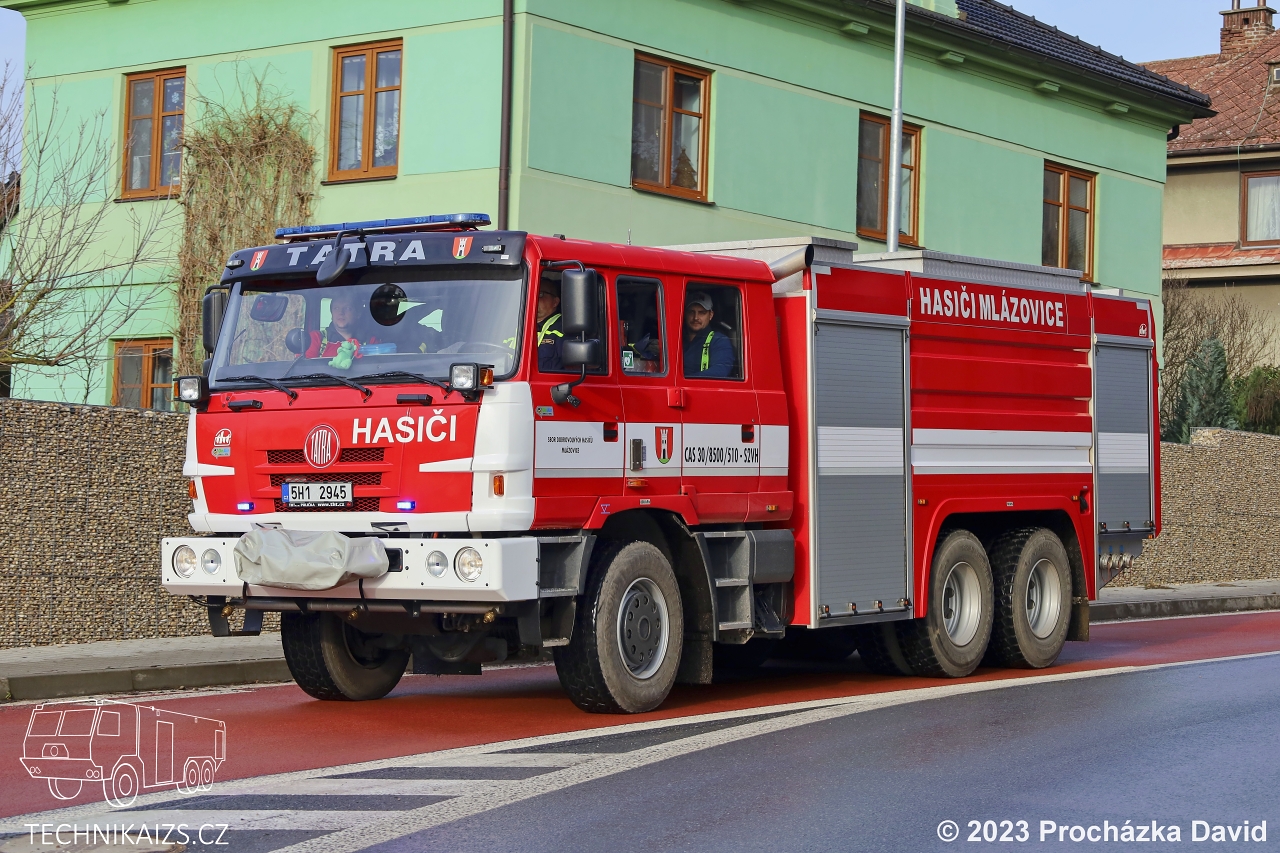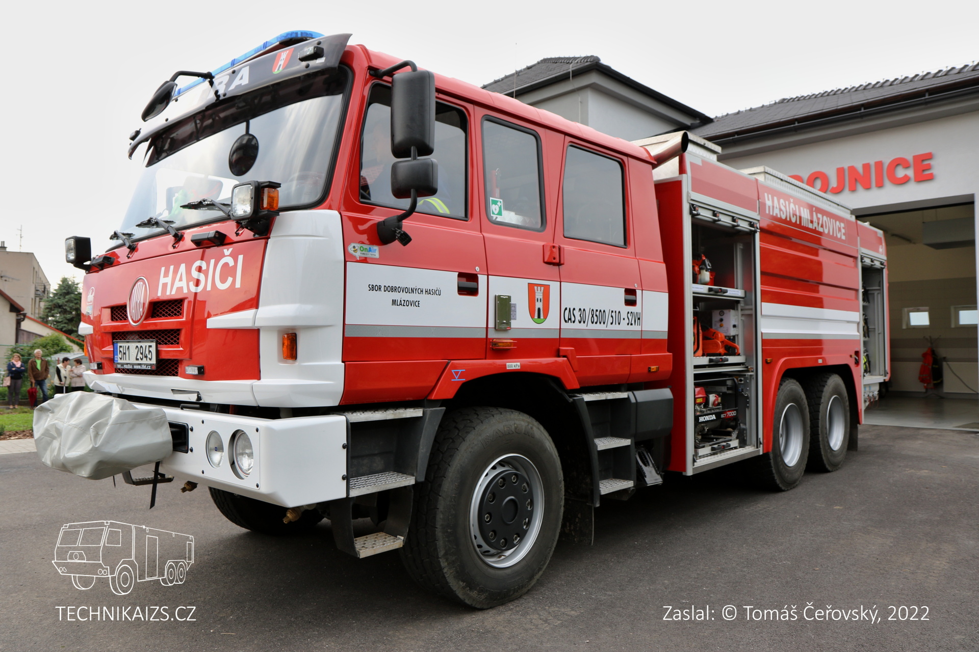 Doplňující info:Podvozek je T815 v konfiguraci 6×6. Pohání jej výkonný tatrovácký motor o výkonu 325 kW, imisní třídy EURO V. Samozřejmostí je možnost nouzového provozu bez příměsí AdBlue, aniž by ztratil výkon či docházelo k jeho poškození. Terénní dostupnost vozu umocňuje velký přední i zadní nájezdový úhel a možnost značného bočního náklonu. Vozidlo je upraveno pro brodění klidnou vodou až do výše 1200mm, což mlázovičtí hasiči, často zasahující na povodních, využijí. Volba padla na klasickou manuální převodovku Tatra 14 TS. Byla upřednostněna před automatem i systémem řazení Norgren z důvodu delší životnosti, velkému střídání řidičů i specifickému terénu, ve kterém se vůz bude pohybovat. Kvůli vysokým pořizovacím nákladům a rychlému opotřebení byla zamítnuta montáž podmítacích řetězů. Brzdy jsou bubnové s ABS. Kabina je prodloužená, pro 6 osob a velké množství výbavy. Ideální pro dobrovolný sbor s jedním zásahovým vozem. Samozřejmostí je klimatizace a nezávislé topení. V opěradlech zadních sedaček jsou integrované dýchací přístroje. Spojovací technika je umístěná ve spodní části přístrojové desky, stejně jako tablet s výjezdovou aplikací. Najdeme zde i přípravu na digitální radiostanici. V kabině je k dispozici zásuvka na 230V i vývod tlakového vzduchu. Dobíjení akumulátorů a plnění vzduchem v klidovém stavu zajišťuje jedinečný systém RetBox. Vůz je opatřen zesíleným alternátorem, který si hravě poradí se zvýšenou spotřebou veškerých světel. Pod předním nárazníkem je instalována asanační lišta a lanový naviják o tažné síle 51 kN. Bezpečnému couvání napomáhá prachotěsná a mrazuvzdorná kamera, jejíž obraz se zobrazuje na displeji v zorném poli řidiče. Je z hliníkových profilů, polepena hliníkovými plechy. Z boku výrazně profilovaná. Nádrž na vodu je z nerezu, objem na vodu činí 8500l, na pěnidlo 510l. Obě nádrže lze propojit v jedinou. Zbylý prostor skýtá značné možnosti pro umístění široké výbavy. Těžké agregáty jsou připevněny na výsuvných platech pro snadnější manipulaci. Dlouhé předměty jsou zabudovány do schrání na střeše vozu. Osazeno je výkonné čerpadlo THT PKA 3000, se jmenovitým průtokem 3000l/min a možností práce s několika vstupy a výstupy najednou.