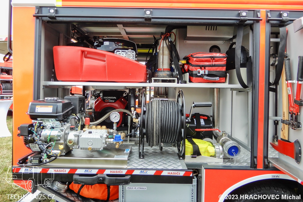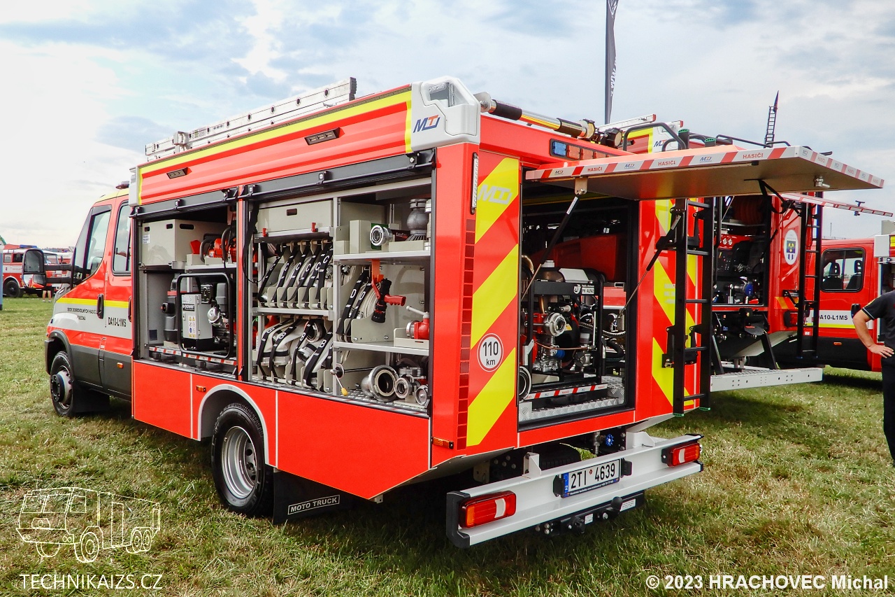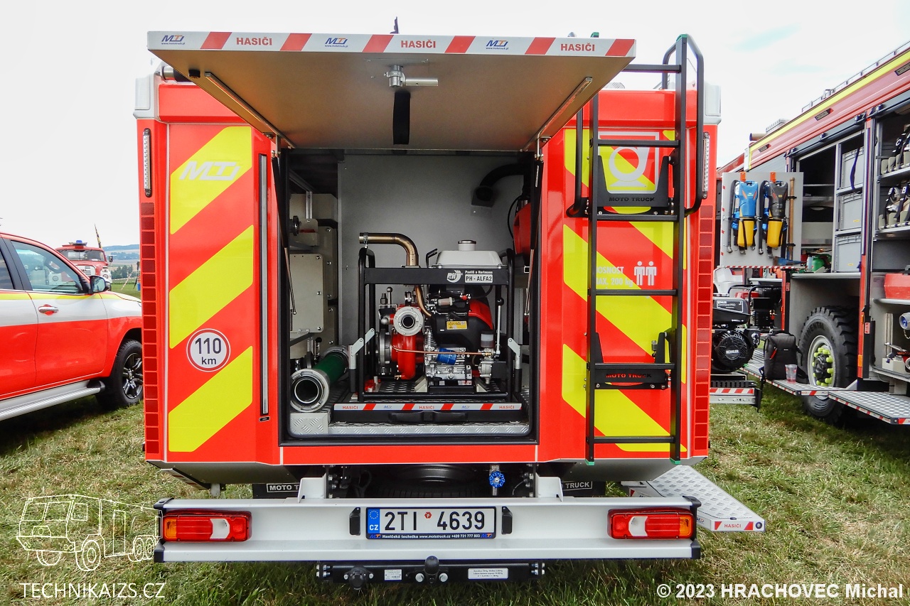 Doplňující info: V březnu 2023 jednotka dobrovolných hasičů převzala od společnosti MotoTruck nový dopravní automobil Iveco Daily za 3 751 000 korun včetně DPH v provedení s motorovou stříkačkou. Iveco Daily 70C18HA8 D–D70C je určen pro provoz na zpevněných komunikacích, poháněn je řadovým přeplňovaným čtyřválcem s automatickou převodovkou. Kabina je čtyřdveřová, šestimístná. Pro spojení slouží digitální vozidlový terminál uchycený mezi sedadly řidiče a spolujezdce. Na stejném místě najdeme čtveřici dobíjecích úchytů pro ruční svítilny a stejný počet určený pro ruční radiostanice. Na přístrojové desce je uchycen výjezdový tablet, nechybí kontrolní a ovládací panel požární nástavby a ovládání červenomodrého světelného a zvukového výstražného zařízení Whelen. V přední části vozu je uchycen elektrický lanový naviják s tažnou sílou 50 kN a s jištěním proti přetížení. Karosérie účelové nástavby tvoří samostatný konstrukční celek z plechů a profilů ze slitiny lehkých kovů technologií šroubovaných spojů, svařování a lepením. Na obou bocích je dvojice schrán pro příslušenství, kryté jsou hliníkovými roletkami. Integrovaná nádrž na vodu je vyrobena z vrstveného polypropylenu o objemu 1 000 litrů. Nádrž je vybavená odvzdušněním a přepadem proti přeplnění, stavoznakem s LED signalizací v zadní části automobilu a plnicím otvorem zakončeným spojkou B75. Na nádrž je napojen vysokotlaký hasicí agregát, který je uložen na výsuvném prvku v levé zadní schráně, v její konstrukci nechybí ani uzavíratelný sací ventil pro zásah přenosnou požární stříkačkou Alpha. Tu najdeme na výsuvném platu v zadní části automobilu. Osvětlení prostoru okolo automobilu je zajištěno vně umístěnými zdroji LED světel zapuštěných do boků a zadní části nástavby.