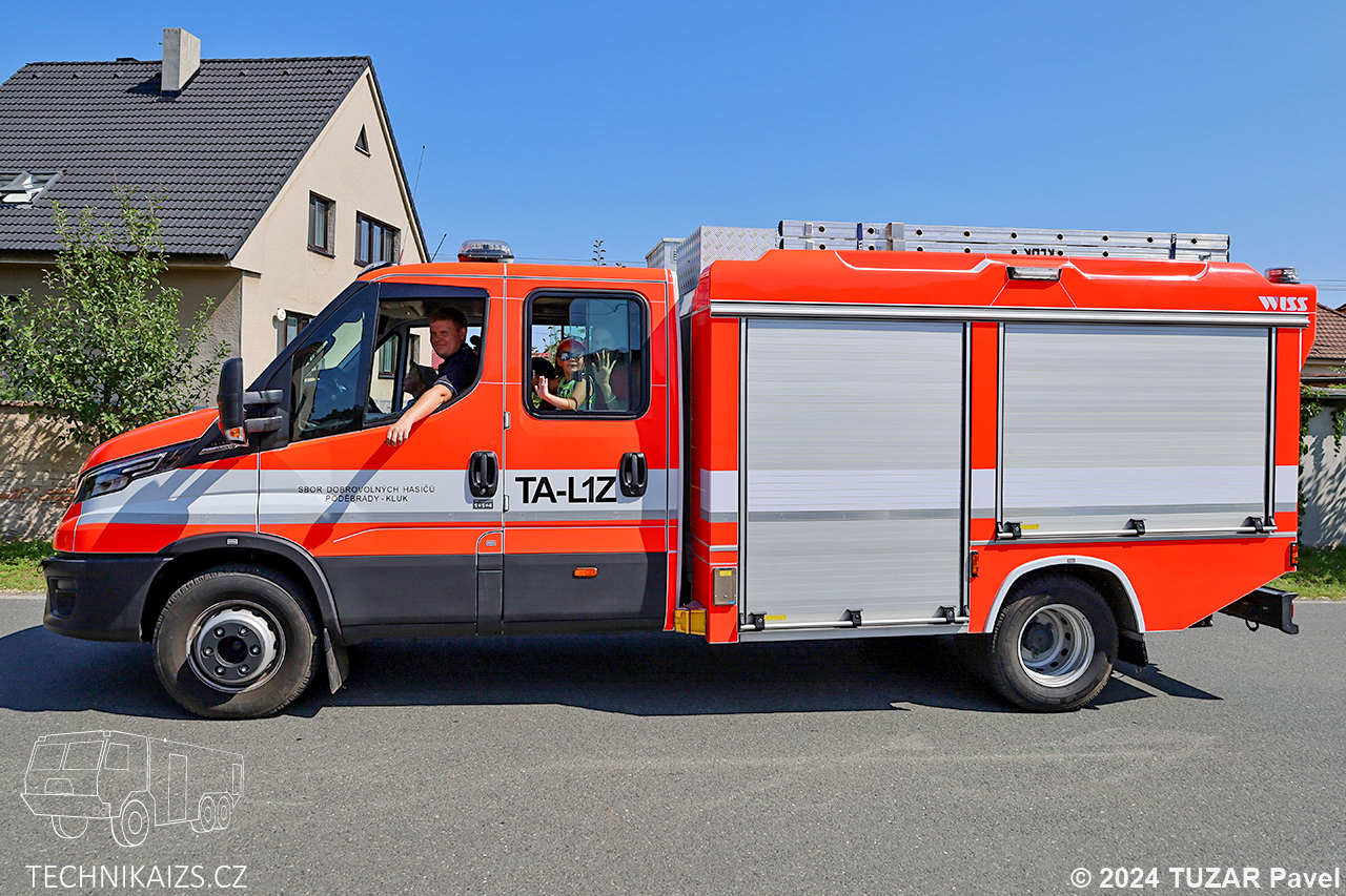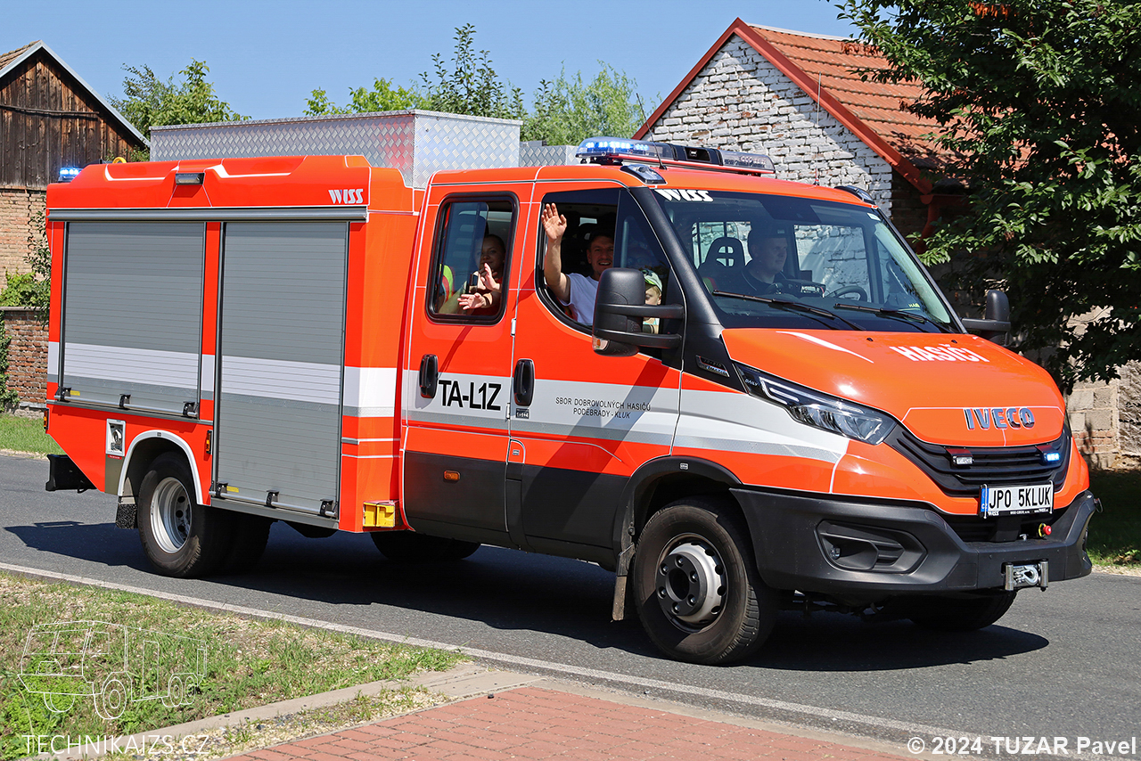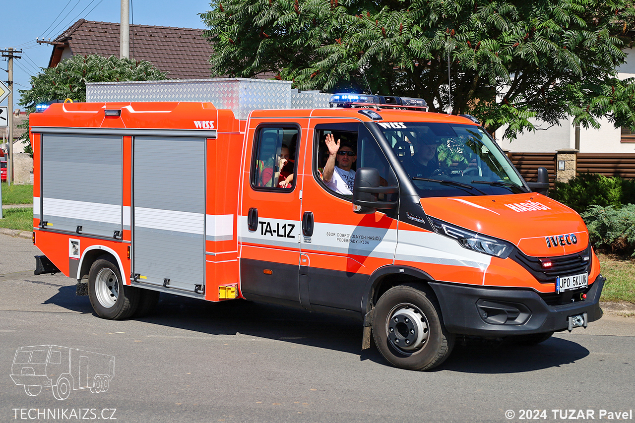 Doplňující info: Technický automobil Iveco Daily pořídilo město Poděbrady pro svou JSDH Kluk v roce 2022 za 3,264 milionu korun včetně DPH od společnosti WISS CZECH, s.r.o.. O pohon se stará motor o výkonu 155 kW spolu s automatickou převodovkou. V kabině vozu je šest míst pro hasiče. Součástí nástavby je integrovaná nádrž na 600 litrů vody, o dodávku vody se stará hasící zařízení PETO HCA 90/23 s vysokotlakou hadicí o délce 60 m. Dále ve výbavě nalezneme mimo jiné i přenosnou motorovou stříkačku, plovoucí čerpadlo či elektrocentrálu. Na přední části vozu je umístěn lanový naviják ComeUp Rhino 8.
