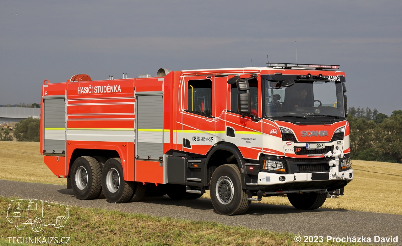 Doplňující info: Jednotka v roce 2023 převzala od zástupců THT Polička zbrusu novou cisternovou automobilovou stříkačku, kterou jednotka naposledy získala v roce 2002. Cisterna je postavena na třínápravovém podvozku Scania s kabinou pro šest osob. O pohon se stará třináctilitrový šestiválec, který má výkon 324 kW splňující normu Euro 5. Nástavba je tvořena třemi samostatnými moduly. Přední a zadní skříně jsou vyrobeny z plechů a profilů ze slitiny lehkých kovů technologií prizmatických šroubovaných spojů. Mezi nimi je nádrž na hasivo, která je vyrobena z nerezové oceli. Pojme 8 500 litrů vody a 540 litrů pěnidla. Vozidlo je v odstínu zářivě červené RAL 3024 doplněné po boku žlutozeleným pruhem. Na nákup cisterny jsme získali dotaci z Generálního ředitelství HZS ČR ve výši 2,5 mil. korun a z Moravskoslezského kraje ve výši 1,25 mil. korun. Zbylou částku dofinancovalo město Studénka ze svého rozpočtu. Celková cena vozidla se pohybuje okolo 9,5 milionu korun. Scania nahradí CAS 32 Tatru 148 z roku 1982.