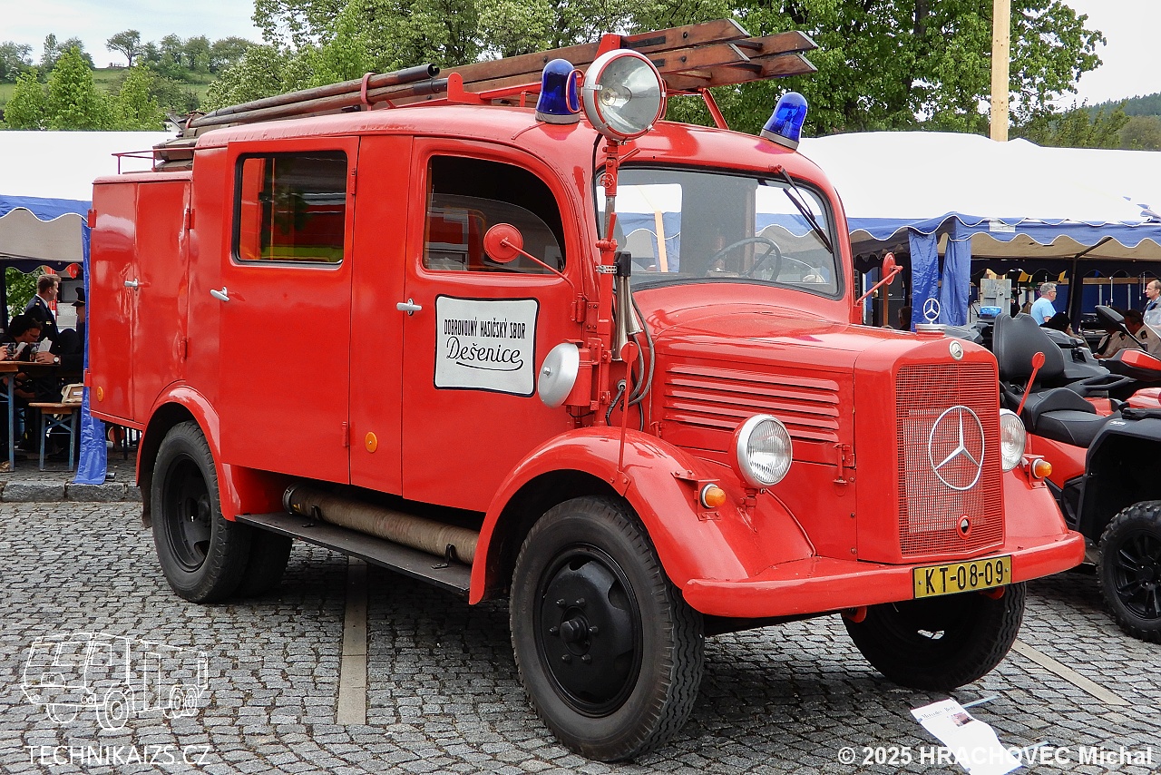Doplňující info: Mercedes byl vyroben v roce 1942 a je poháněn benzínovým čtyřválcovým motorem o objemu 2 594 cm³ s výkonem 60 koní. Motor je vodou chlazený, spřažený s převodovkou s čtyřmi rychlostními stupni vpřed a jedním vzad. Brzdy jsou hydraulické. Celková hmotnost vozidla je 2 450 kg, s dovoleným zatížením včetně řidiče činí 1 450 kg. Vozidlo pojme posádku 1+8. Automobil je dvounápravový s pohonem zadní nápravy. Vybaven je tažným zařízením s povolenou celkovou váhou přívěsu až 2 550 kg. Vůz byl původně zakoupen německými hasiči, kteří žili v Sudetech, původní barva byla khaki. 3.4. 1946 došlo k přepsání na místní hasičský sbor Dešenice. Vozidlo je vybaveno základním vybavením včetně přenosné motorové stříkačky PS8.